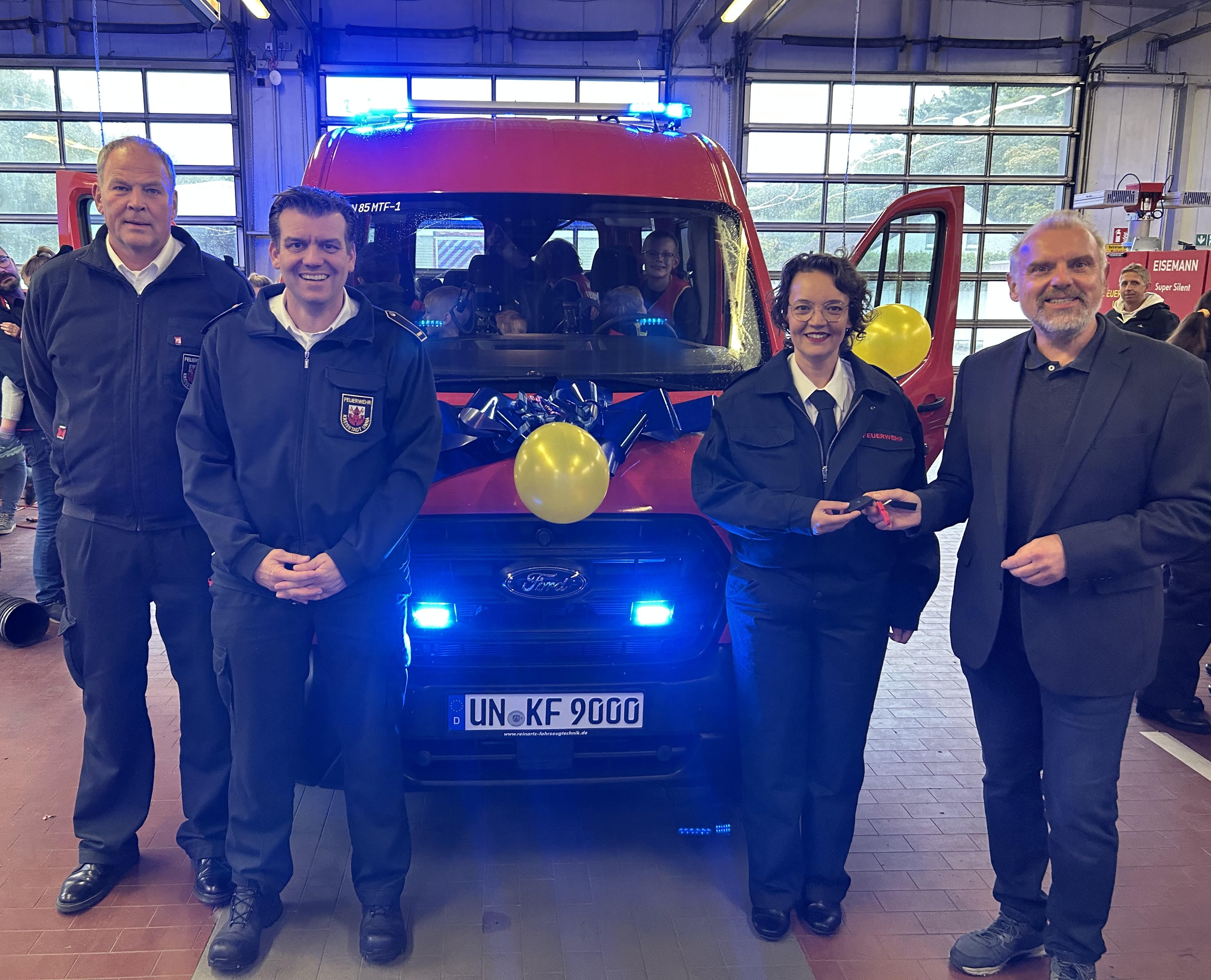 Wehrleiter Hendrik zur Weihen und der Leiter des Amtes für Feuerschutz und Rettungswesen, Christian Luppa, freuen sich mit der Leiterin der Kinderfeuerwehr, Chantale Born, über das neue Mannschaftstransportfahrzeug für die Kinderfeuerwehr, das Bürgermeister Dirk Wigant (von links) im Rahmen der Geburtstagsfeier der Kinderfeuerwehr offiziell übergab.