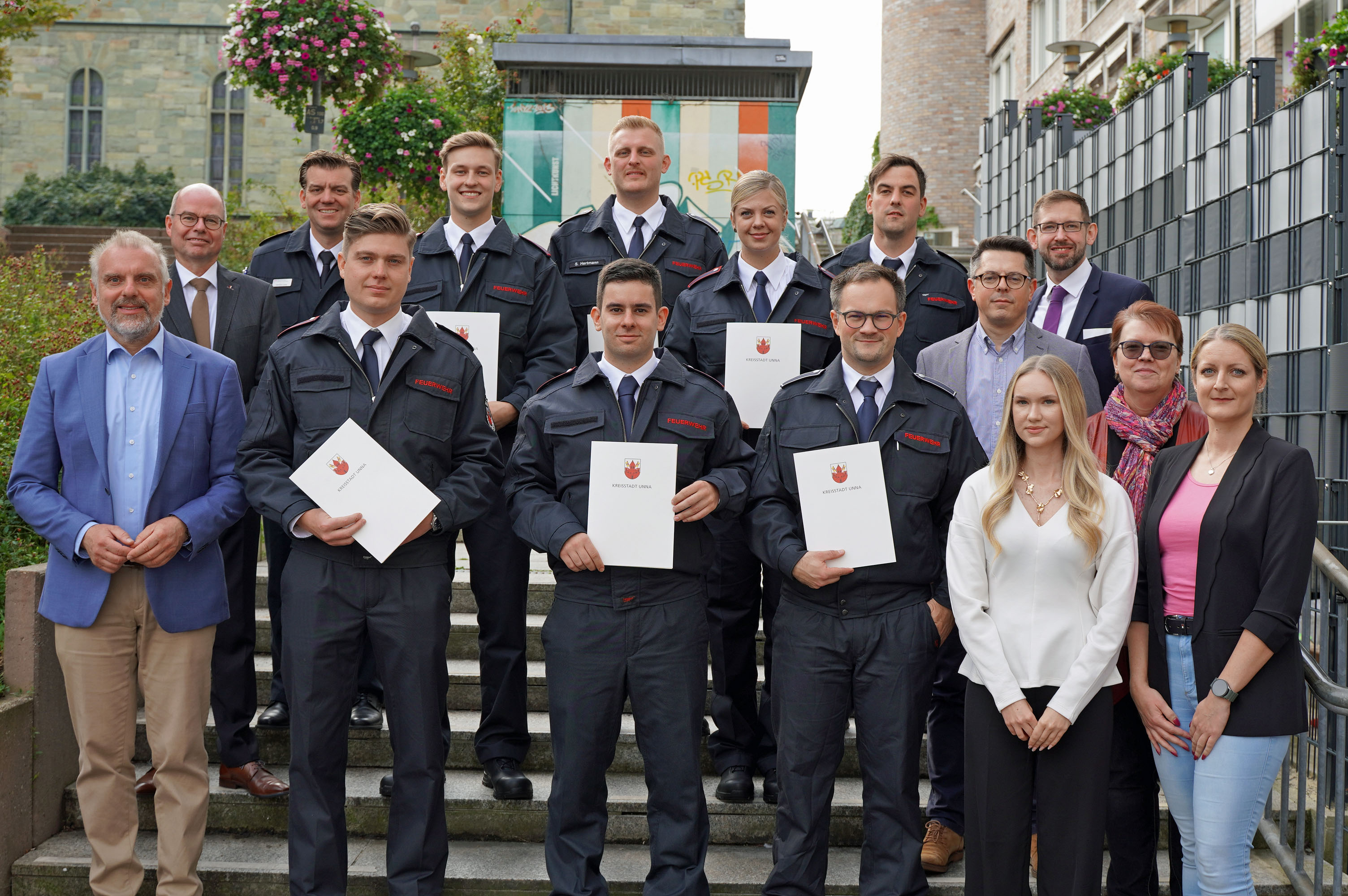 Nachwuchs für die Feuerwehr der Kreisstadt Unna: Vier neue Brandmeisteranwärter*innen sowie zwei Brandoberinspektoranwärter nehmen zum 1. Oktober 2025 ihren Dienst auf. Bürgermeister Dirk Wigant begrüßte und vereidigte die Nachwuchskräfte am Montag, 29. September 2025, im Rathaus. Als Brandoberinspektoranwärter werden Steffen Hartmann und Fabian Steffens eingestellt. Als Brandmeisteranwärter*innen werden Pascal Banner, Corvin Goldschmidt, Nicolas Goertz und Jana Strube eingestellt. Am 1. Oktober 2025 beginnen die Nachwuchskräfte ihren Dienst in der Feuerwehrschule am Standort Lünen. Das Foto zeigt sie mit Bürgermeister Dirk Wigant (l.), dem für Feuerschutz und Rettungswesen zuständigen Beigeordneten Markus von der Heide (2.v.l.), dem Amtsleiter für Feuerschutz und Rettungswesen, Christian Luppa (3.v.l.), sowie Vera Trautmann (Personalrat, r.), Katja Sahmel (Gleichstellungsbeauftragte, 2.v.r.), Sandro Wiggerich (Erster Beigeordneter (3.v.r.), Leonie Pauka (Jugend- und Auszubildendenvertretung, 4.v.r.) und Sebastian Koch (Ausbildungsleiter, 5.v.r.).