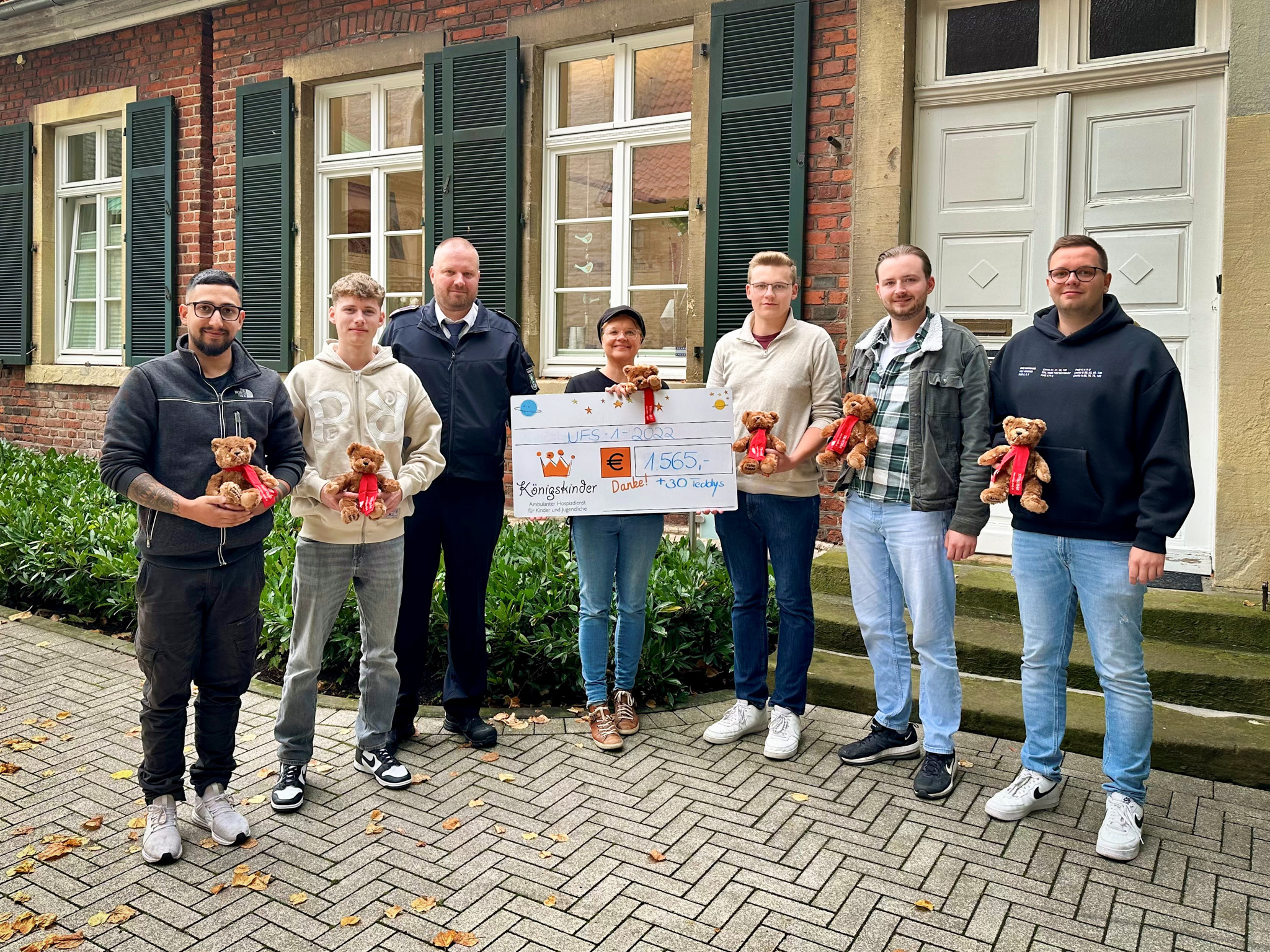 Silke Kreuznacht vom Kinderhospizdienst „Königskinder“ (Mitte) freut sich über die Spendenübergabe durch (von links nach rechts) Daniel Ciba, Elias Klomfaß, Martin Simiantkowski, Jakob Kalthegener, Tim Schulze Holthausen und Fabian Busche.