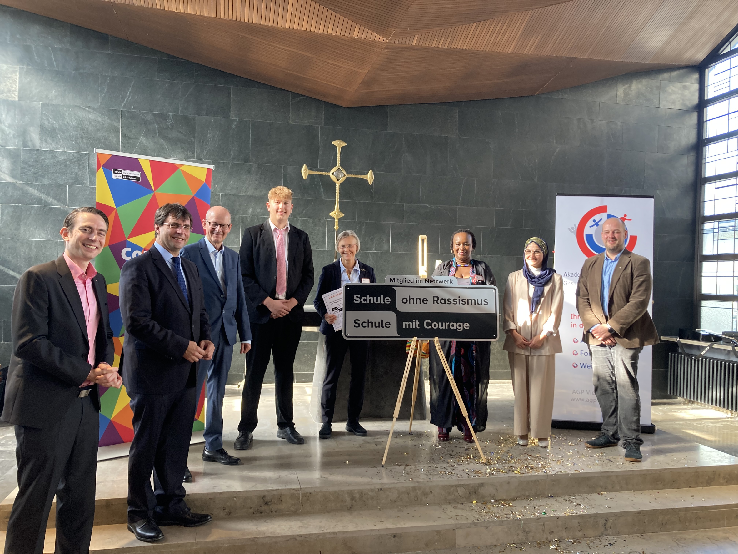 v.l.n.r.: Christian Schrödter (Geschäftsführer der AGP Viersen GmbH), Marcus Optendrenk (Minister der Finanzen in NRW und Abgeordneter des Landrats NRW, Pate der Schule), Wolfgang Güdden (Vorsitzender des Vereins ASV Einigkeit 1860/03/06 Süchteln e. V., Pate der Schule), Fynn Windeck (Schüler), Ilona Thelen (Schulleiterin der AGP Viersen GmbH), Lucy Fleischmann (Integrationsbeauftragte der AGP Viersen GmbH), Emina Kara (Schülerin) und Jens Loebbert (stellvertretender Abteilungsleiter des Kommunalen Integrationszentrums Kreis Viersen).