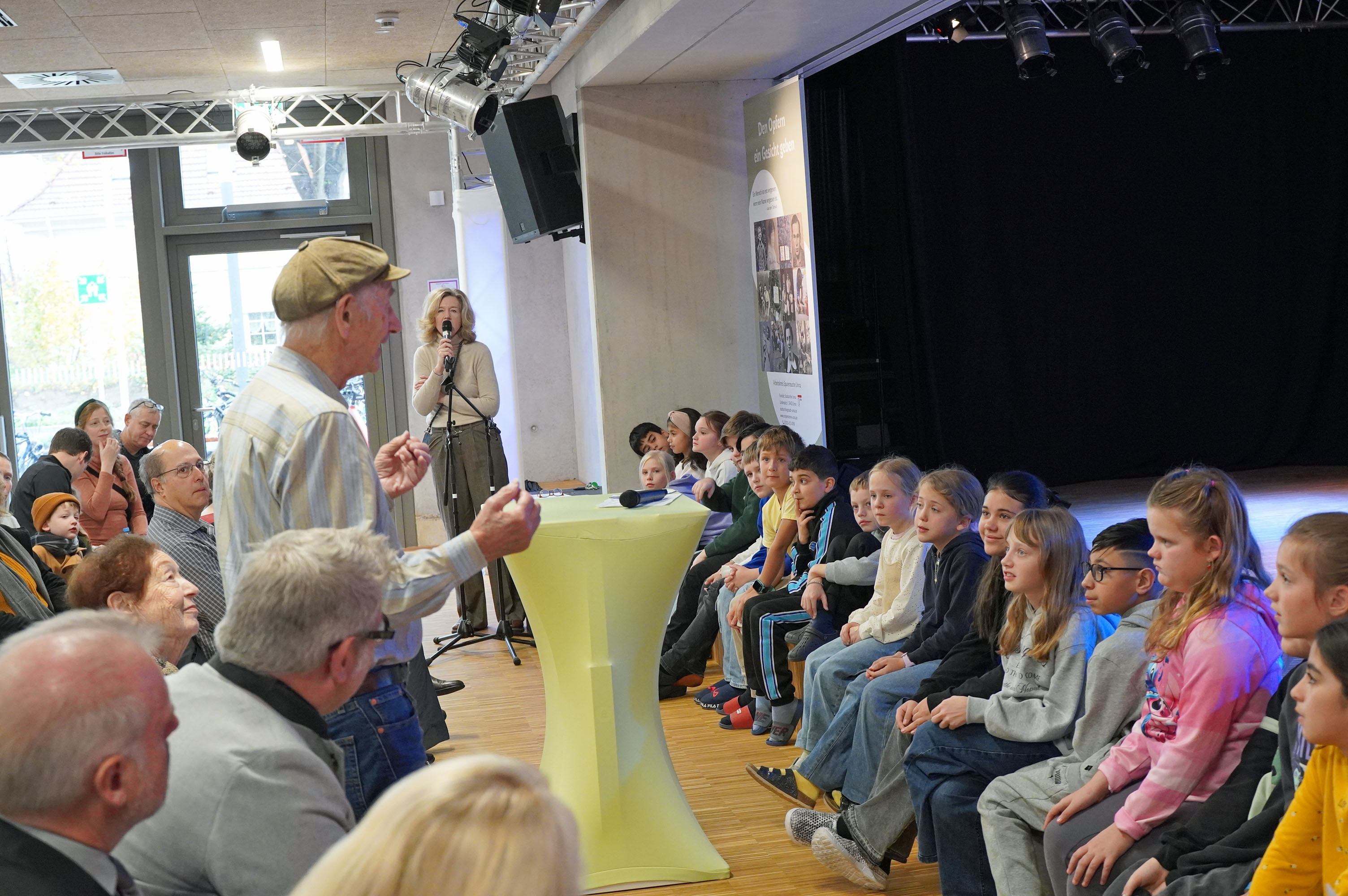 Manfred Lindenbaum (links, stehend) dankt den Schülerinnen und Schülern der Grundschule Am Hertinger Tor für ihre Beiträge zur Einweihungsfeier des Ruth-Lindenbaum-Platzes.
