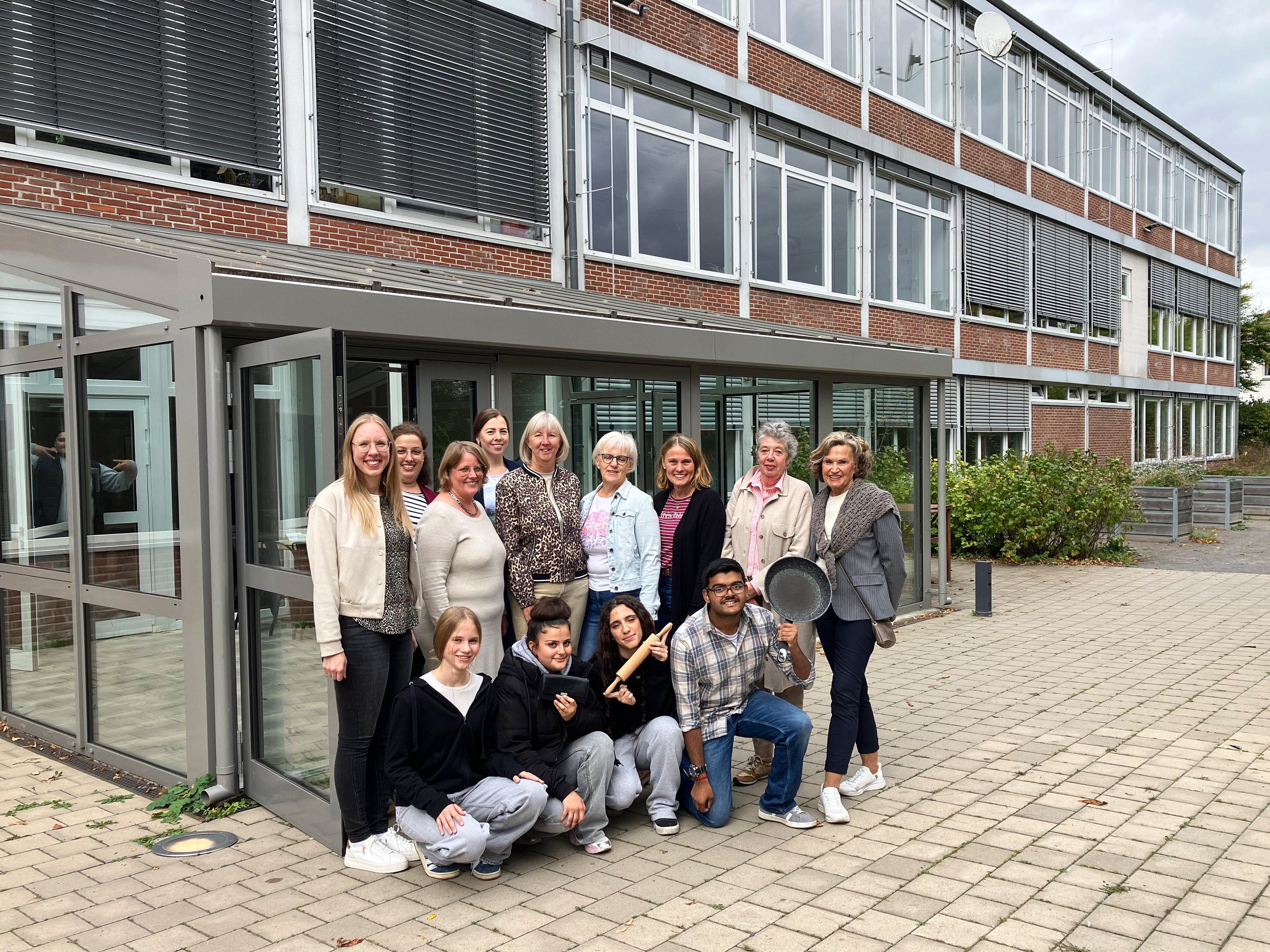 Rabea Dörner, Schulleiterin der AWS (2.v.li.) und Sylvia Mersmann (3.v.re.,hinten) freuen sich auf die Umsetzung des neuen Mittagstischs, bei dem sie von vielen ehrenamtlichen Helferinnen, dem Kollegium der Schule sowie den Schülerinnen und Schülern des Cafés tatkräftig unterstützt werden.