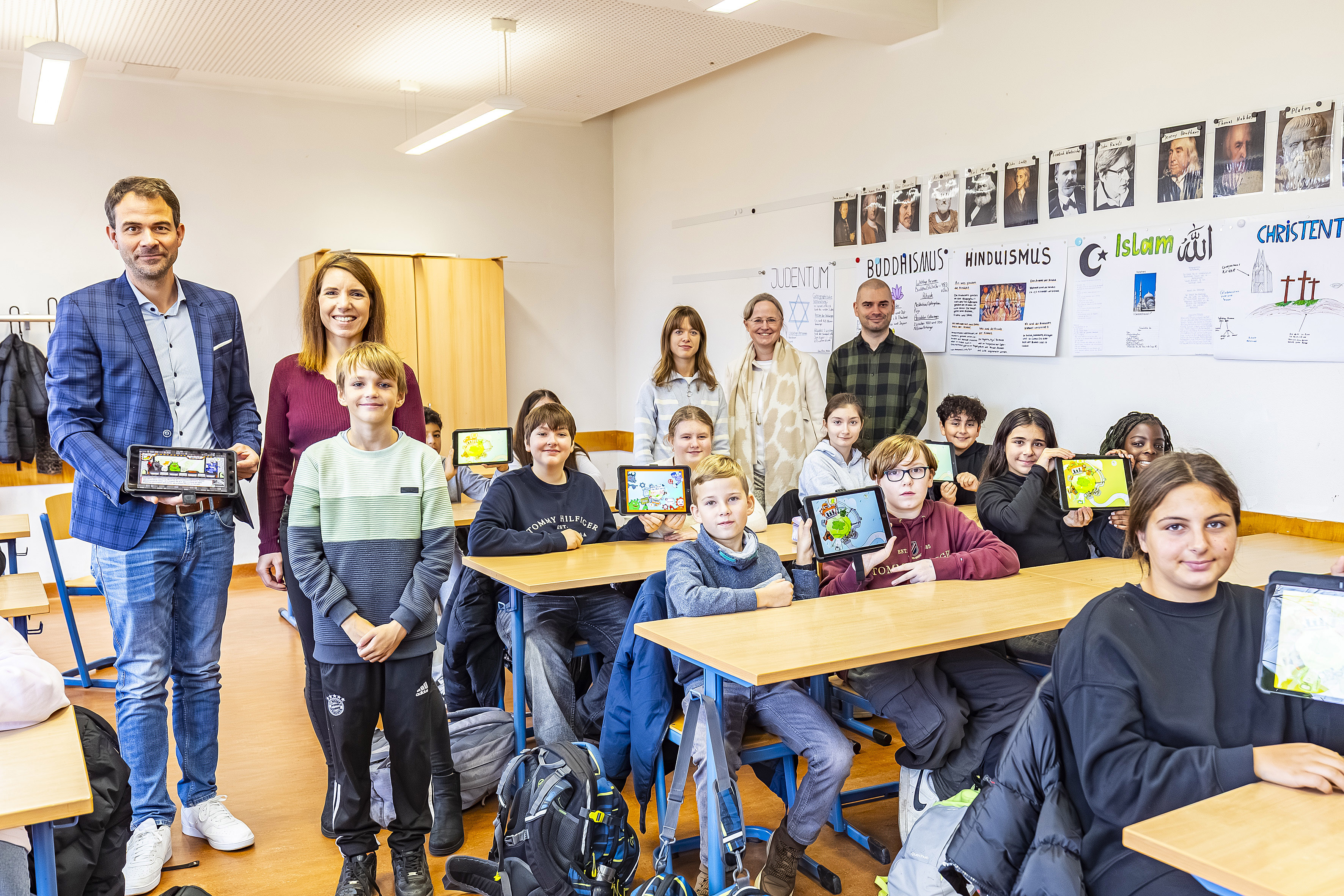 Der ASH stellt die Hamm-Edition der App "Die Müll AG" vor. (stehend von links: ASH-Betriebsleiter Robert Reminghorst, stellv. Leiterin ASH-Öffentlichkeitsarbeit Jennifer Borm, Klassenleitung Selina Heilmann, Rektorin Anja Bainksi, Klassenleitung Tobias Torka)