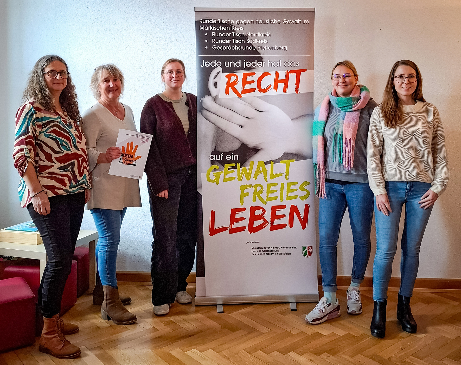 v.l.: Birgit Reckermann und Stefanie Seppelt (Frauenberatungsstelle MK, Frauen helfen Frauen e. V.), Caroline Unger (Gleichstellungsstelle Lüdenscheid), Merle Schümann-Basse (Frauenhaus im MK, AWO), Patricia da Cruz Santos (Gleichstellungsstelle Iserlohn).