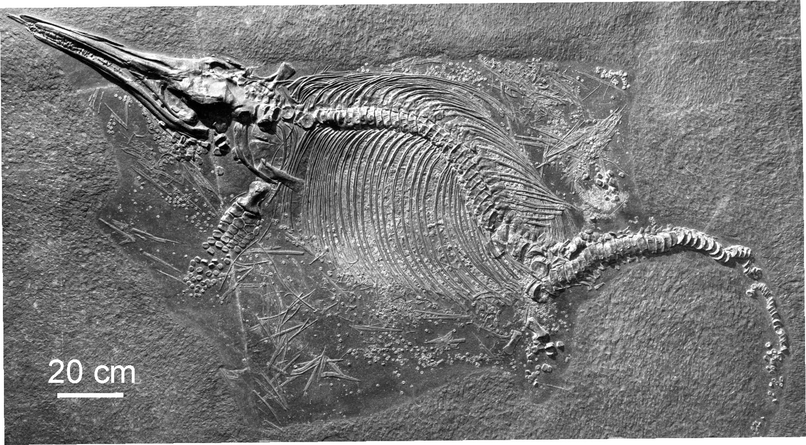 Stark zerfallenes Skelett eines Ichthyosauriers aus dem Posidonienschiefer, Opfer der ominösen “Kadaver-Explosion”?