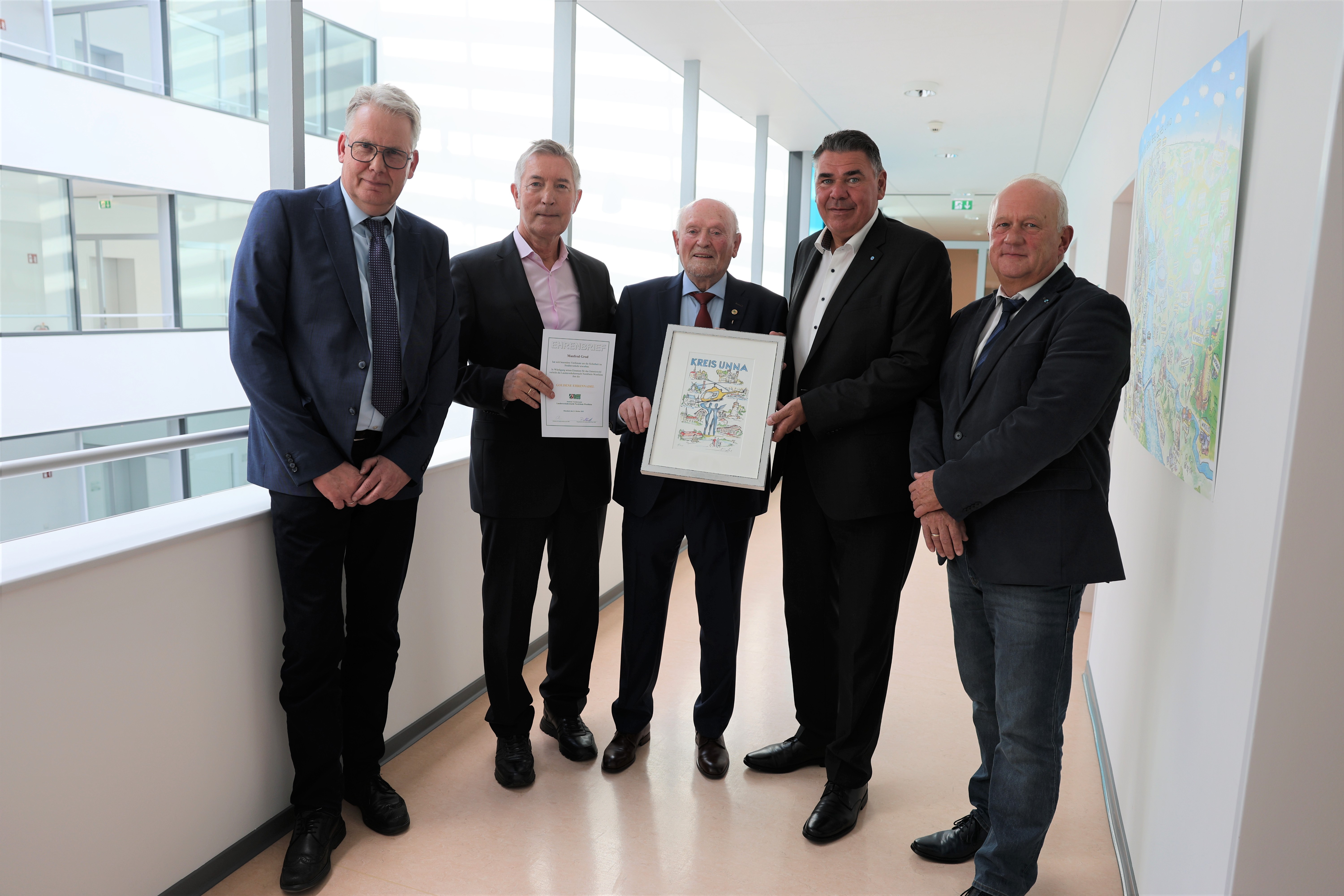 Christoph Funke, Leiter der Straßenverkehrsbehörde des Kreises Unna, Peter Schlanstein, Vizepräsident der Landesverkehrswacht NRW, Manfred Grod, Landrat Mario Löhr sowie Dezernent Holger Gutzeit. Foto Leonie Joost – Kreis Unna