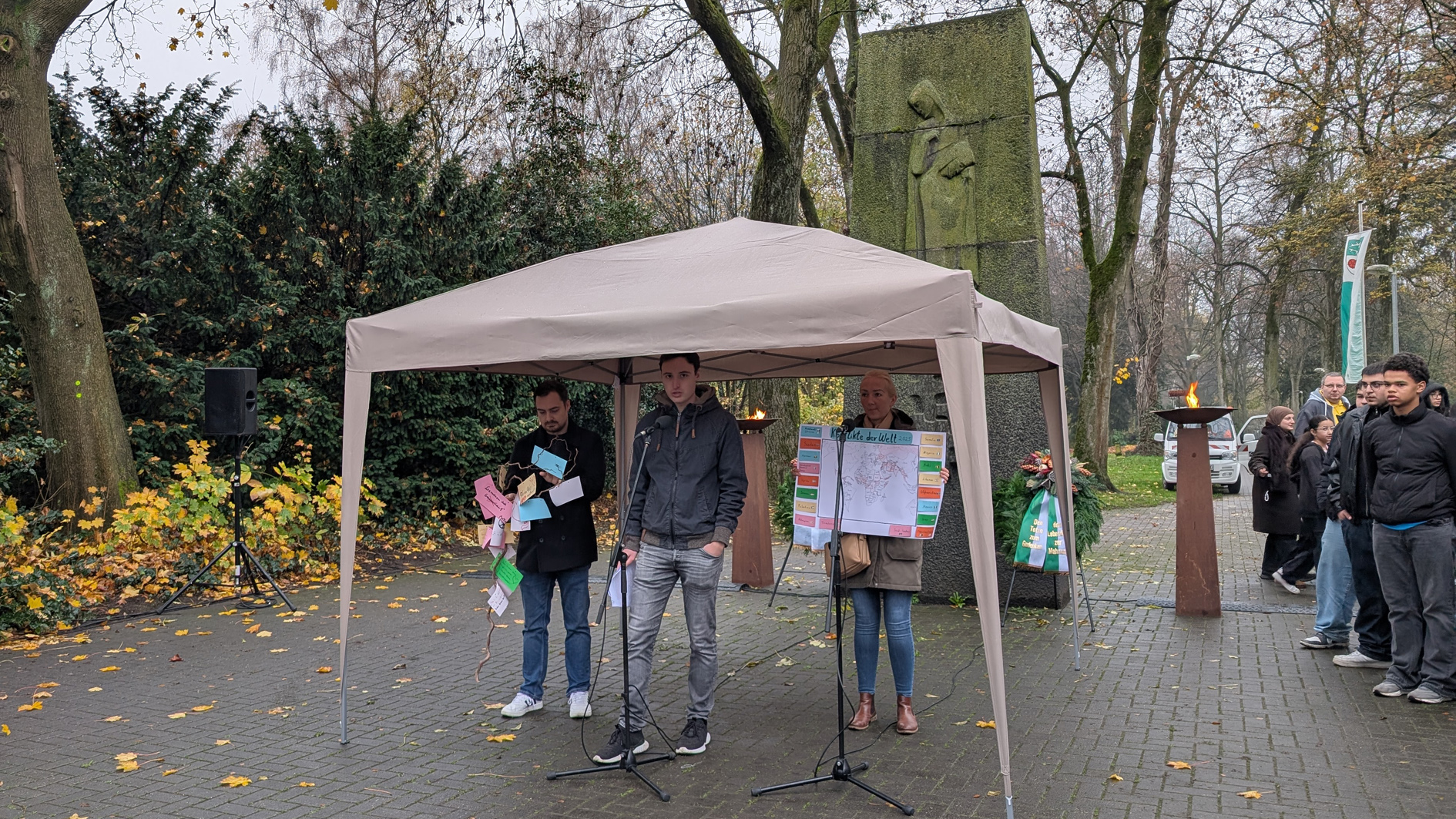 Lehrkräfte des Städtischen Gymnasiums präsentierten eine Konfliktkarte und einen Friedensbaum mit Botschaften, die ihre Schülerinnen und Schüler für den Volkstrauertag entworfen hatten. (Foto: Stadt Herten_Jana Putze)