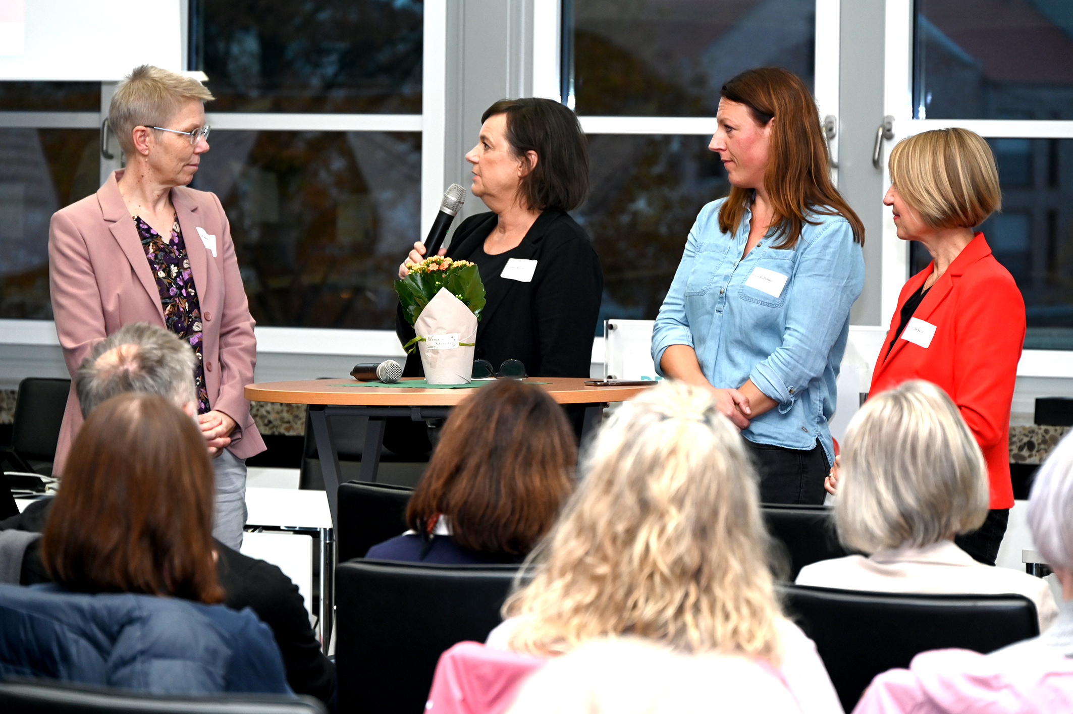 An den Diskussionsrunden mit reger Beteiligung nahmen auch teil (v. l.): Sonja Bruns (Leitung Amt für Schule, Sport und Integration Kreis Steinfurt), Andrea Konjer (Pädagogische Mitarbeiterin RBN Kreis Steinfurt), Hannah Dißen (Leiterin Schule am Bagno in Steinfurt) und Brigitte Janz (Leitung Geschäftsbereich I Stadt Ibbenbüren).