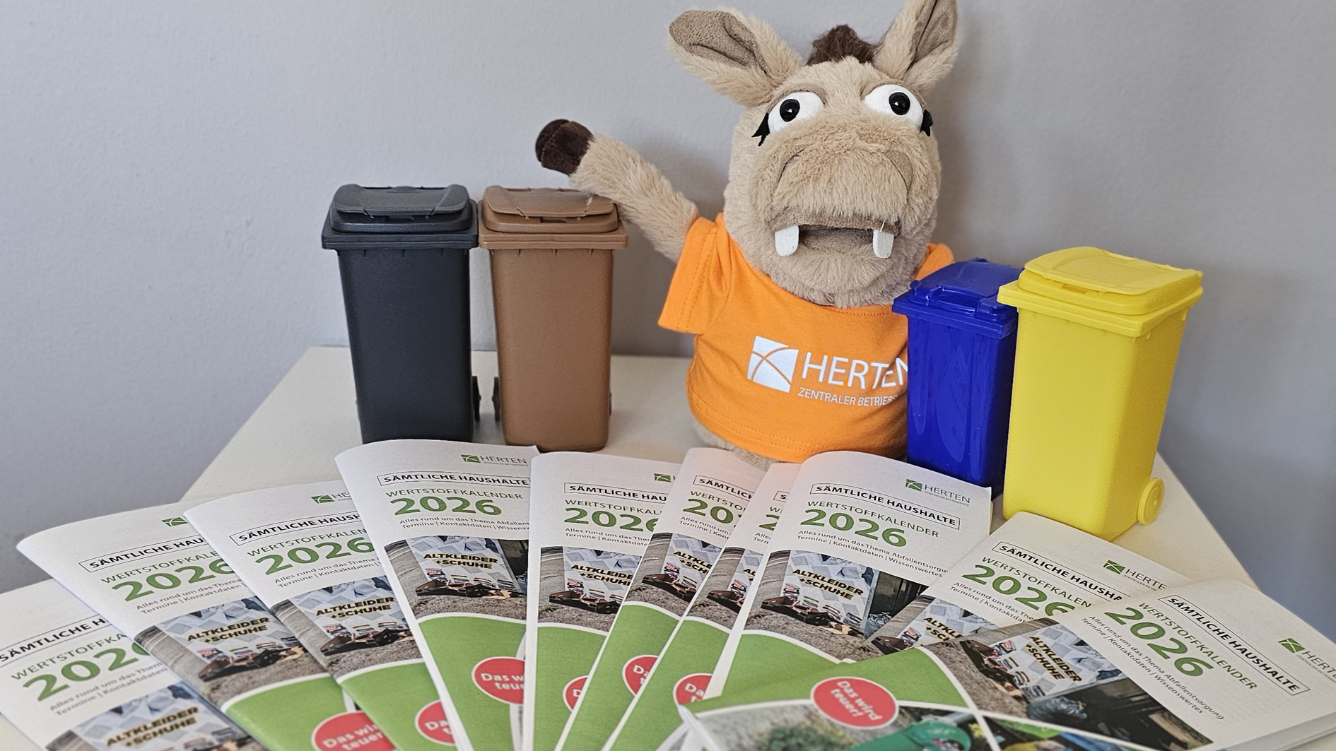 Vor Hedda, dem Maskottchen des Zentralen Betriebshofs Herten (ZBH), liegen schon die ersten Exemplare des Wertstoffkalenders für 2026. Hertenerinnen und Hertener erhalten ihre Ausgaben demnächst mit der Hauspost. (Foto: Stadt Herten_Andrea Eckert)