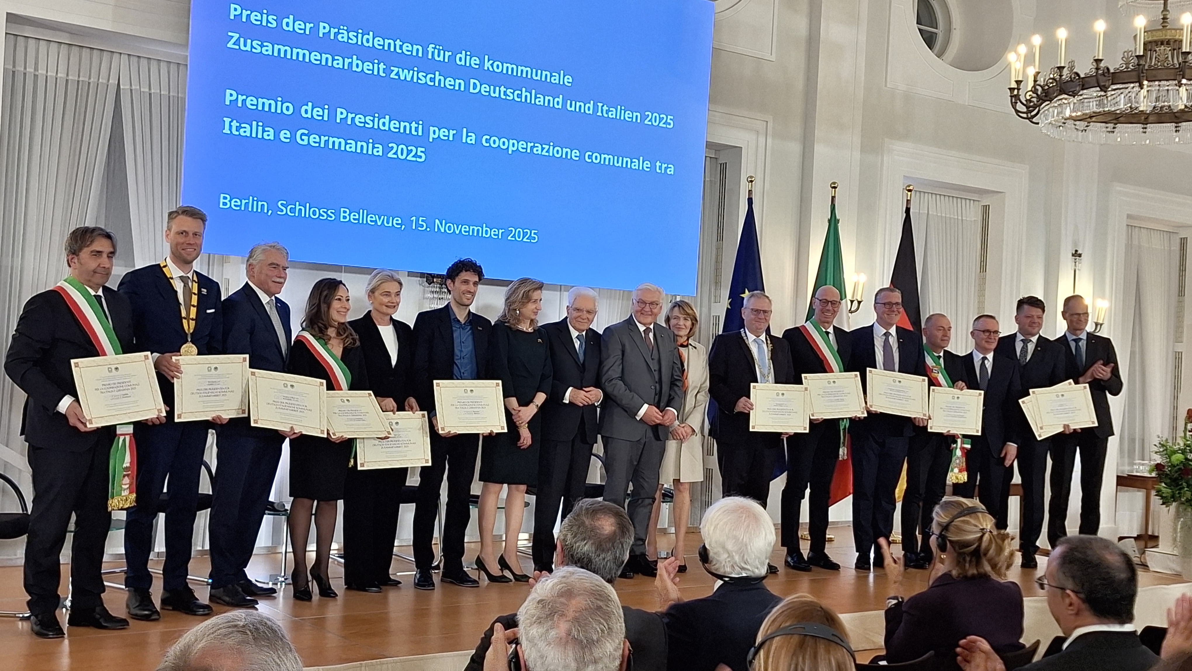 Die Preisträger des deutsch-italienischen Partnerschaftspreises mit Bundespräsident Steinmeier und Staatspräsident Mattarella. Foto: Stadt Wertheim
