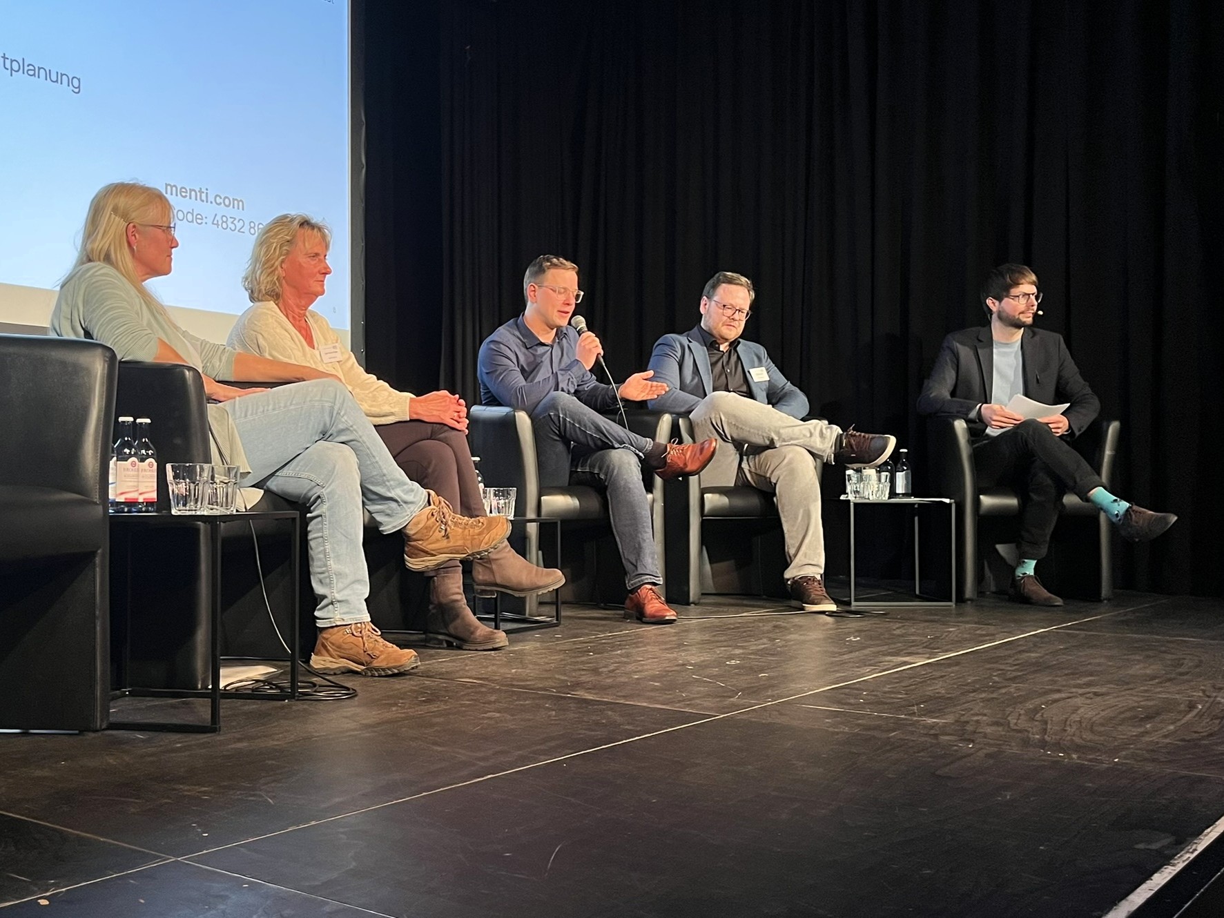 Vier Handlungsfelder hat die Stadt Osnabrück beim Klimaschutz ausgemacht. Vorgestellt werden sie von den zuständigen Fachleuten (von links): Birgit Rademacher für Bildung/Ernährung, Ute Fritsch-Riepe für Strom, Tim Plieninger für Wärme und Roman Karl für Mobilität. Sören Hage moderiert beim Klima-Abend.