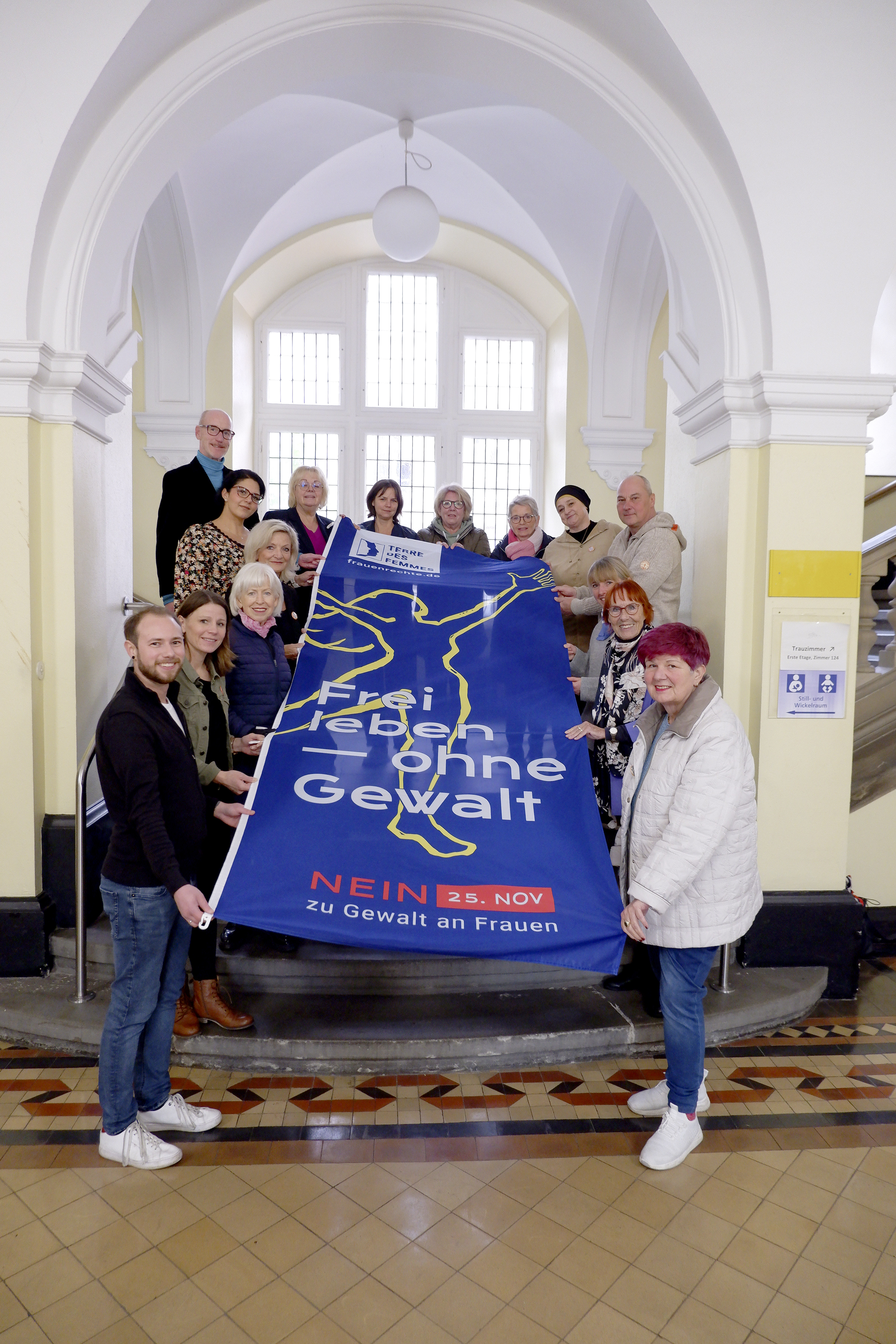 In Hamm werden anlässlich der "Orange Days" Banner des Vereins TERRE DES FEMMES e. V. mit der Aufschrift „Frei leben – ohne Gewalt“ gehisst.