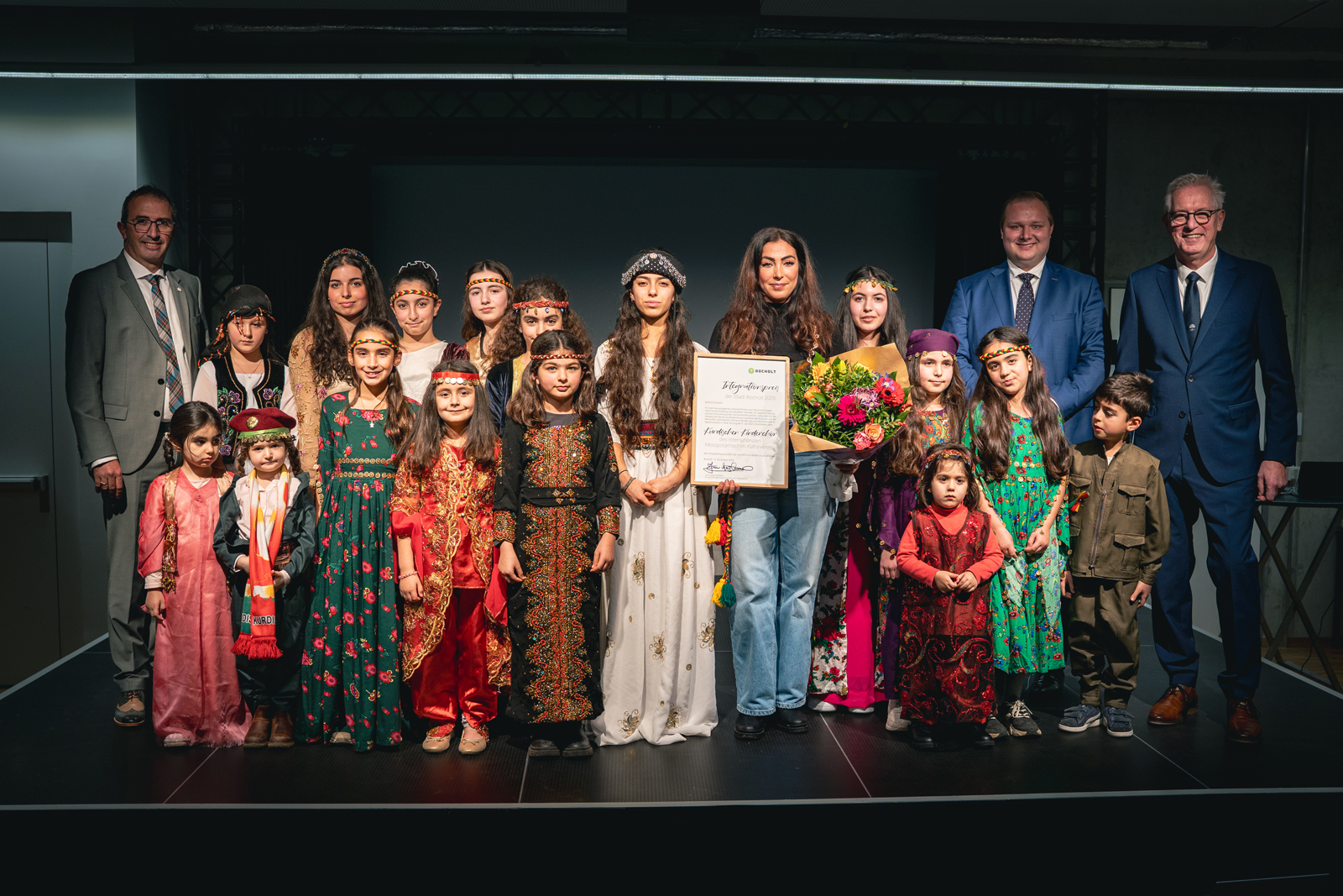 Integrationspreisträger 2025, der Kurdische Kinderchor unter der Leitung von Selda Koldamca (mit Urkunde) erhielt den Preis aus den Händen von Juan Lopez Casanava (links) sowie Michael Wiesmann und Fabian Bohland (v.r.)