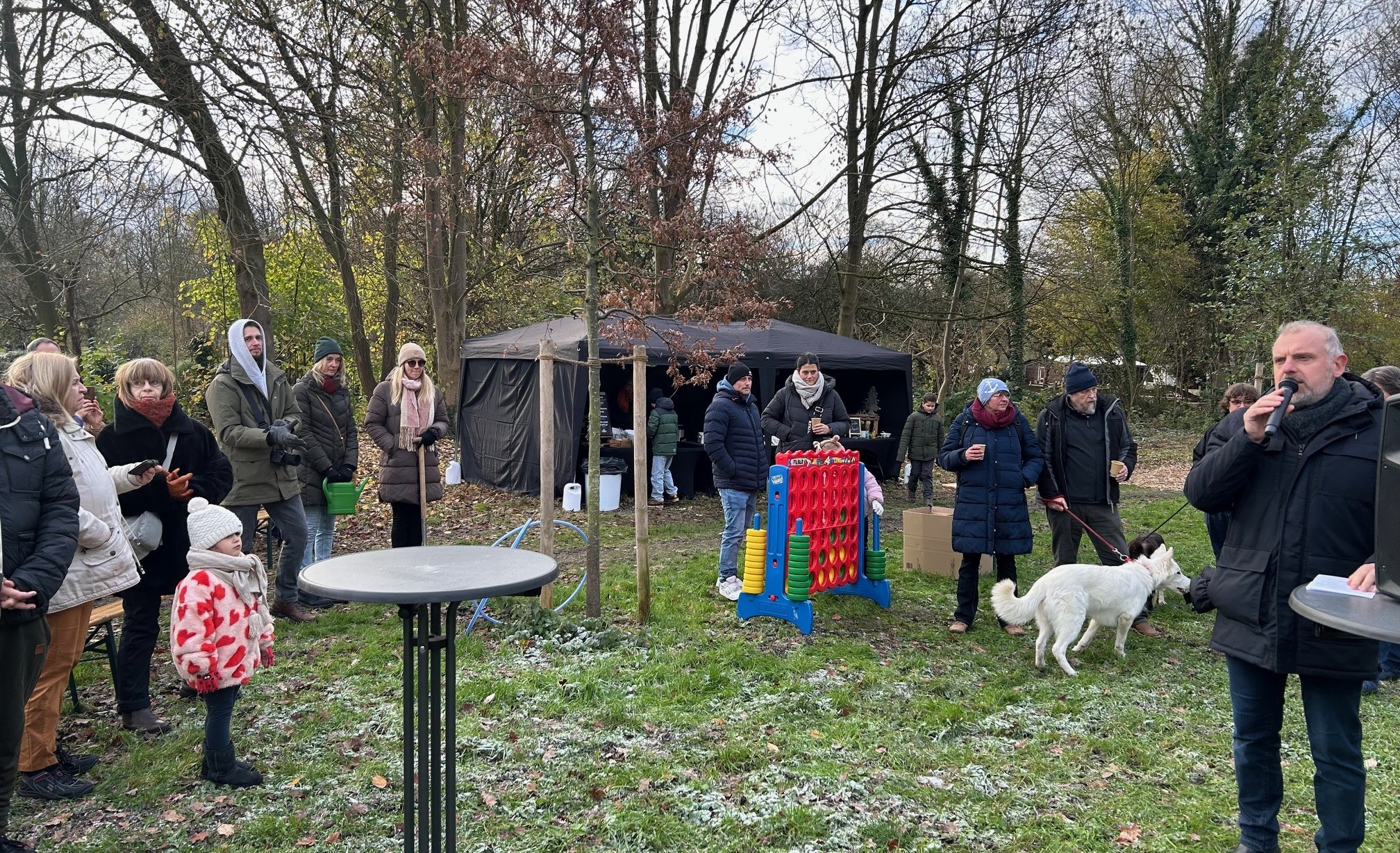 Bürgermeister Dirk Wigant begrüßte die Baumpatinnen und Baumpaten. Bereits im frühjahr waren 40 Bäume auf der Wiese im Kurpark gepflanzt worden.