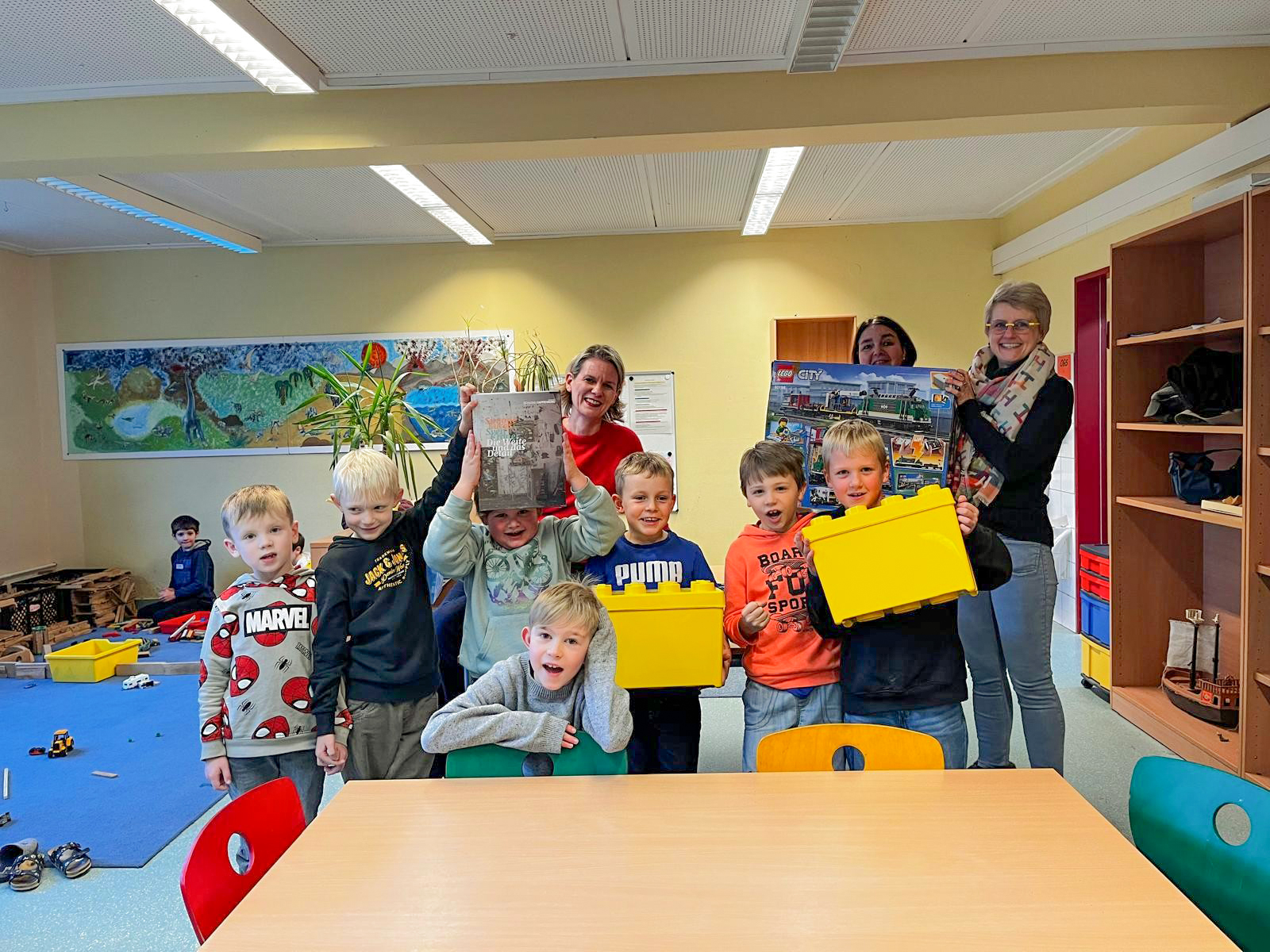 Brandon, Lucian, Ben, Lias, Michel, Julian und Aurelio freuen sich über die Lego-Spende des Kreises Unna, die Marion Freitag und Ulrike Mahltig (r.) an die Kinder und die OGS-Leitung Bettina Friemoth (2. v. r.) überreichten. Foto: Sonnenbergschule