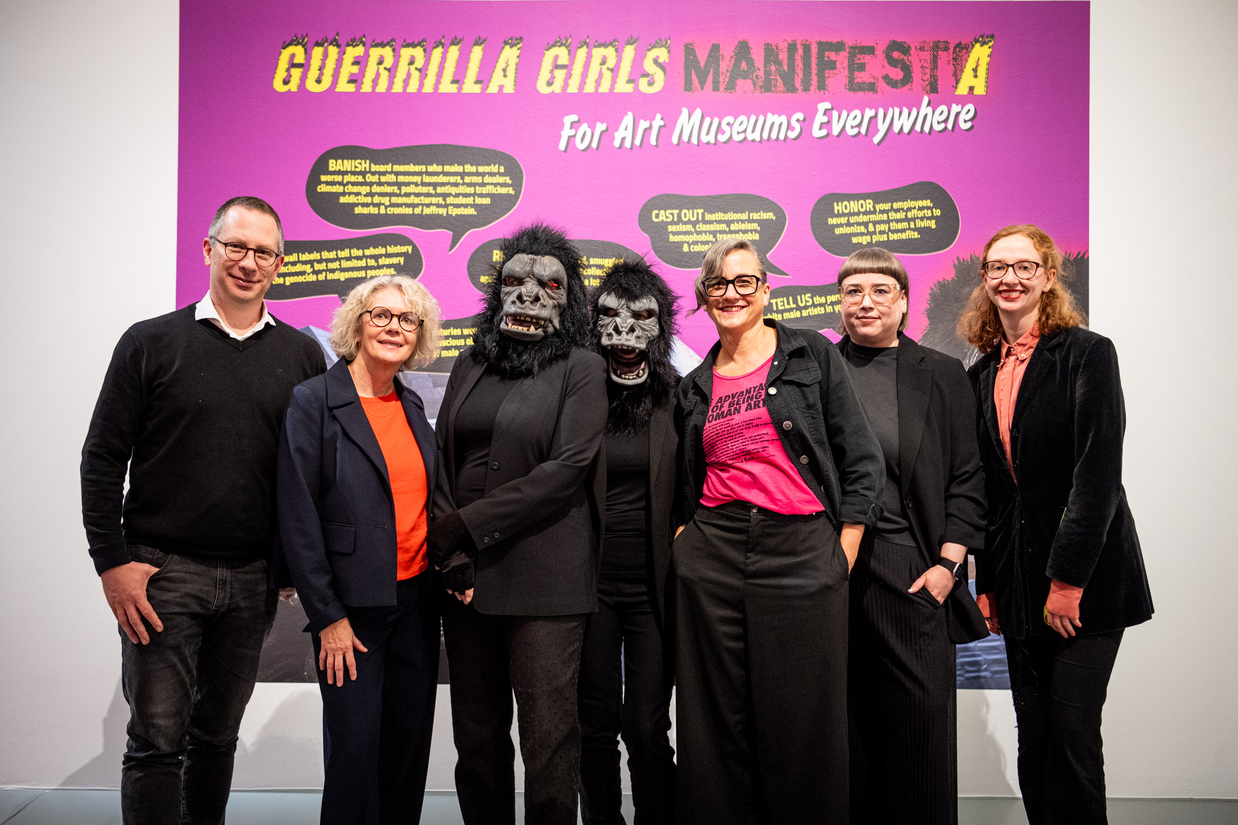 Vl.: Benjamin Sieber (Freunde des MO), Regina Selter (Direktorin des MO), Frida Kahlo und Käthe Kollwitz von den Guerrilla Girls, Dr. Nicole Grothe (Sammlungsleiterin des MO), Prof. Dr. Sarah Hübscher, Clara Niermann (Volontärin).
