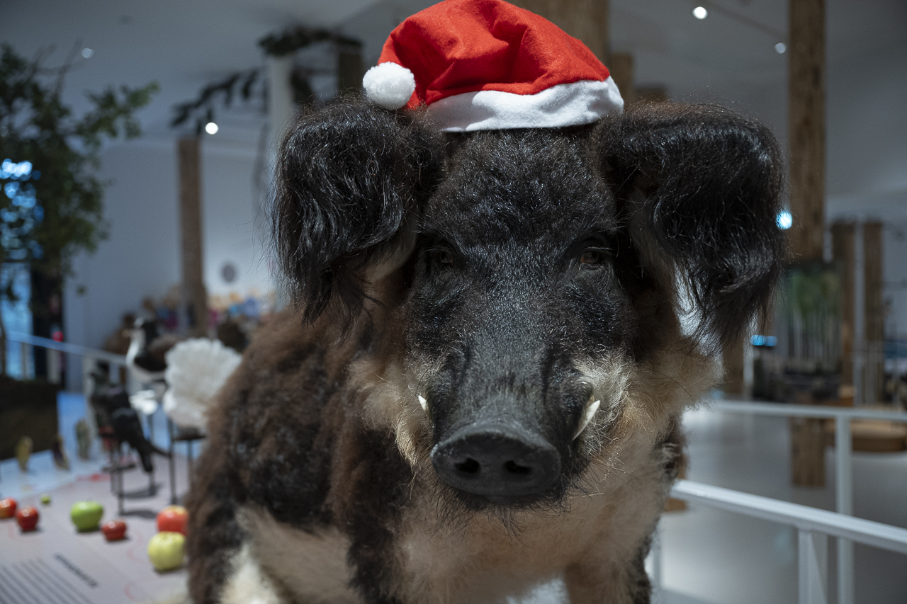 Auch die Tiere in der Dauerausstellung sind in Weihnachtsstim-mung, hier das Wollschwein.