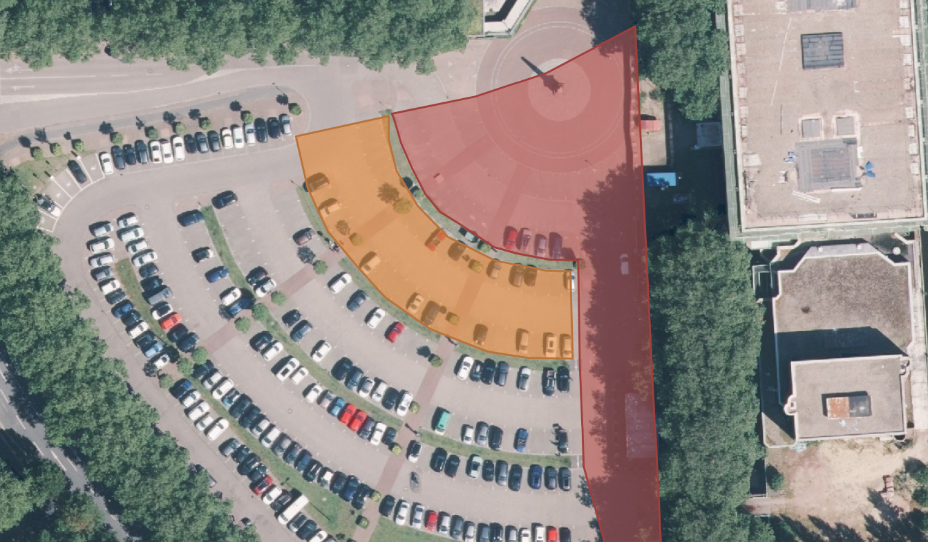 In der sogenannten 2. Bauphase werden ab dem 15. Dezember 15 Parkplätze (roter Bereich) gesperrt. Ab dem 2. Januar werden in der 3. Bauphause weitere 42 Parkplätze vorrübergehend wegfallen (orangener Bereich).