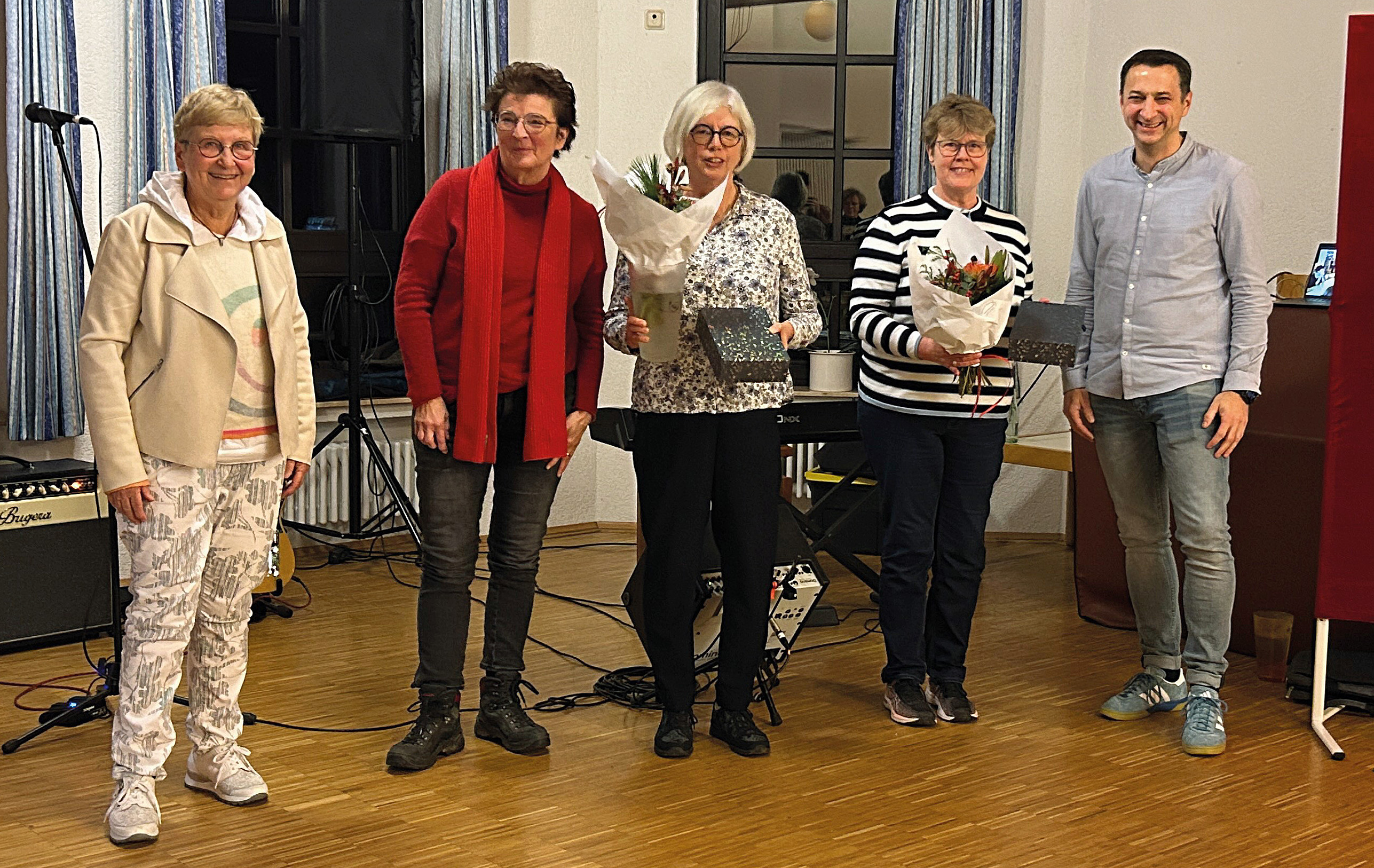 Astrid Holzbeck (Bücherei St. Katharina, Bildmitte) und Silvia Zey (Bücherei St. Marien, 2.v.r.) nahmen stellvertretend für die über 30 Ehrenamtlichen den „Ehr-Win“ entgegen. Das Foto zeigt sie mit Gabi Müller-Vorholt (l.) von der Ehrenamtsagentur Unna sowie Simone Melenk (2.v.l.) und Michael Volkery von der Bürgerstiftung Unna.