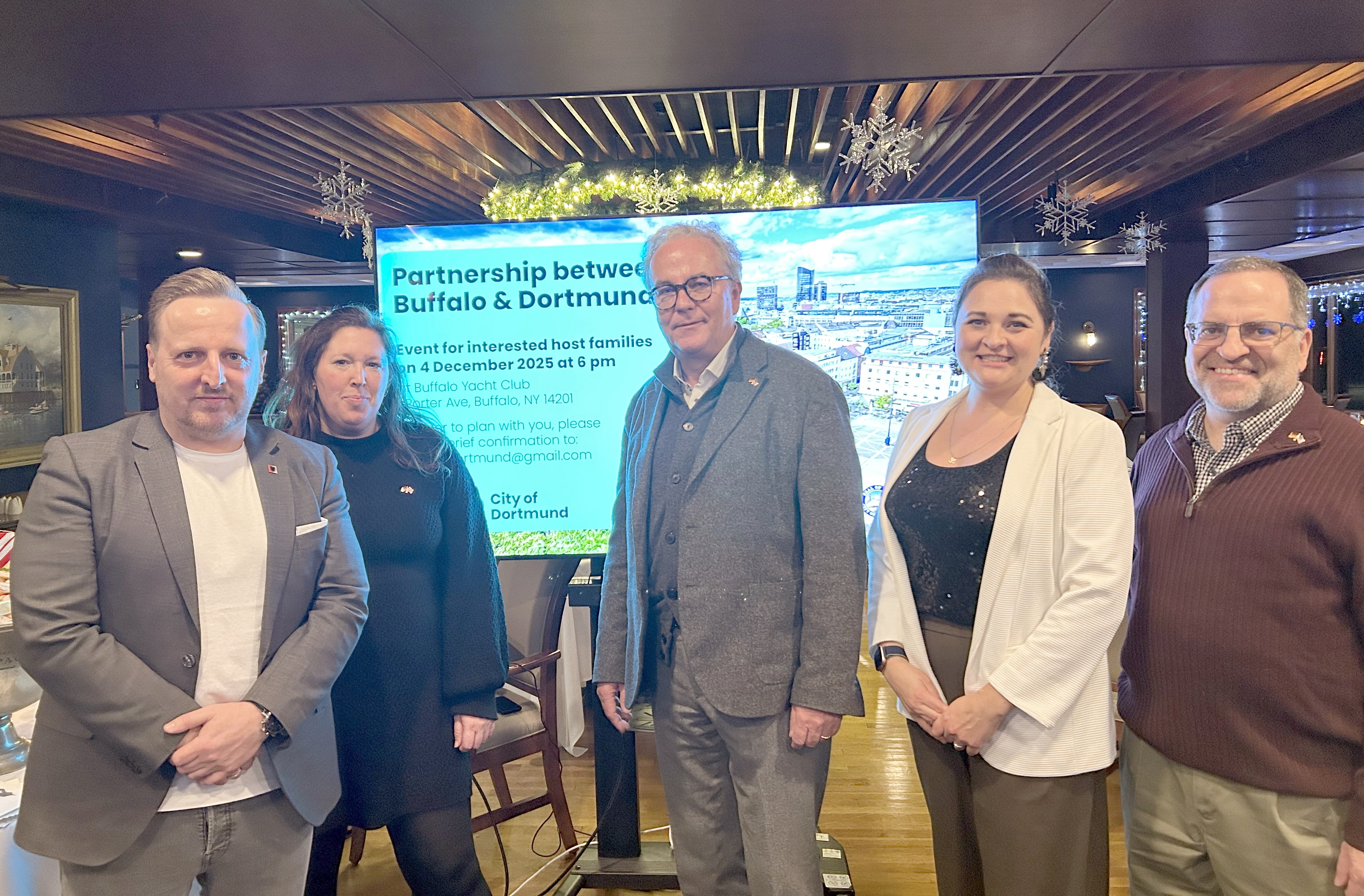 Von links: Fabian Zeuch und Bettina Sauerwald aus dem Büro für Internationalen Beziehungen der Stadt Dortmund, Klaus Wegener (Präsident Auslandsgesellschaft.de), Amy Hardy (Programmdirektorin Highschool-Austausche), John Kleinmann (Präsident Sister City Committee Dortmund-Buffalo).