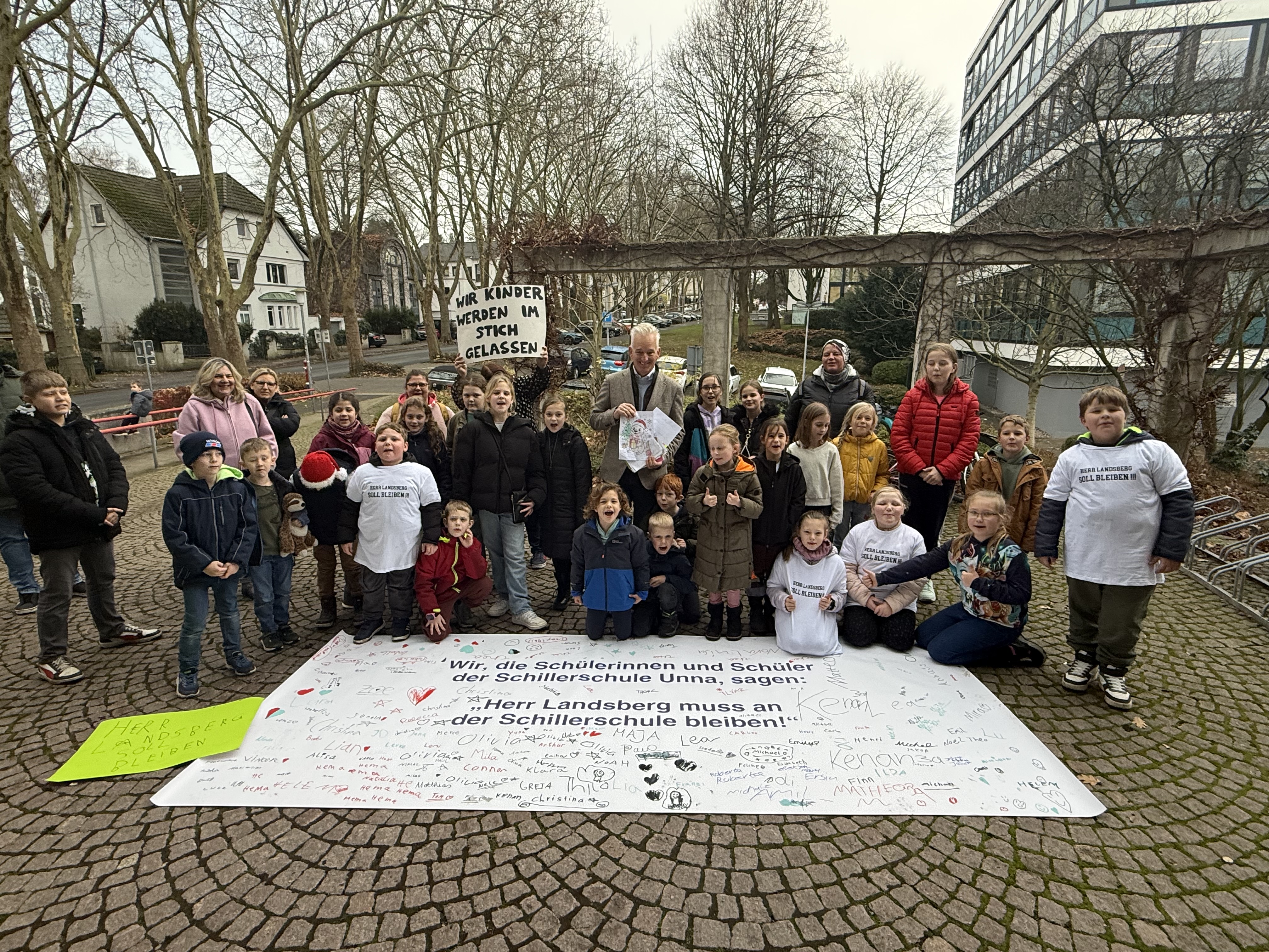Das Plakat mit den Schülerinnen und Schüler von der Schillerschule vor dem Schulamt für den Kreis Unna. In der Mitte: Dezernent Sven Brüggenhorst.