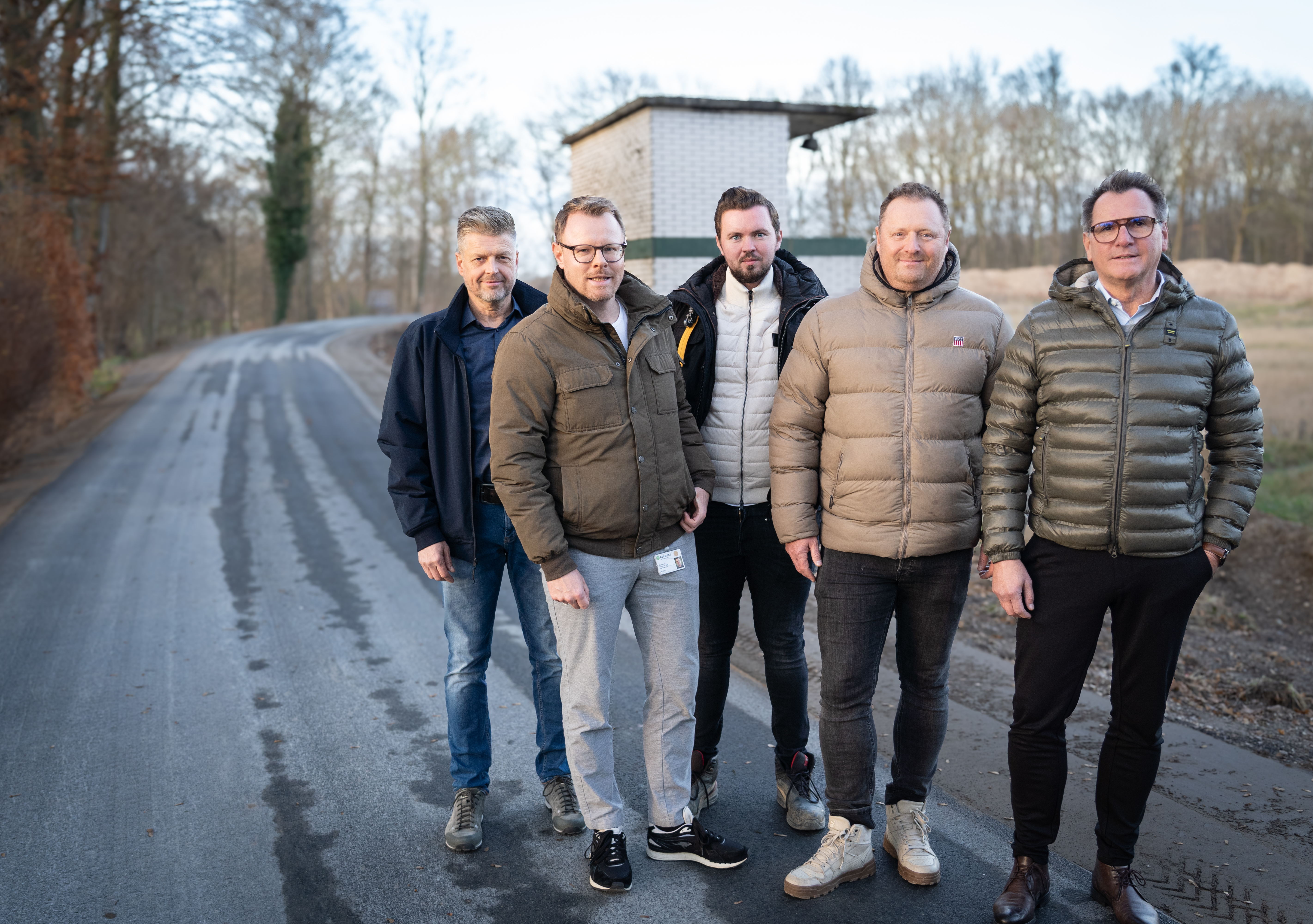 Freuen sich über die Fertigstellung der Asphaltumfahrung am neuen Bikepark (v.l.n.r.).: Jörg Biermann (Vereinsmitglied RC Bocholt 77 e.V. sowie Architekt Bikepark), Thomas Boekhorst (stv. Fachbereichsleiter Schule und Sport), Maximilian Haus (Planer Asphaltumfahrung), Boris Fastring (Vorsitzender RC Bocholt 77 e.V.), Dirk Lueg (Fachbereichsleiter Schule und Sport).