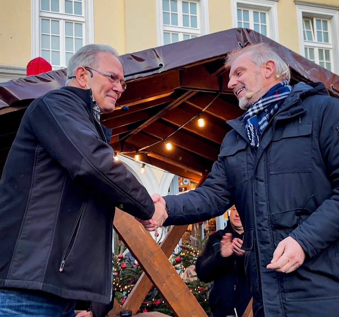 Bürgermeister Dirk Wigant gratuliert Jonni Krause (von rechts) zur Auszeichnung mit der Ehrennadel der Kreisstadt Unna.