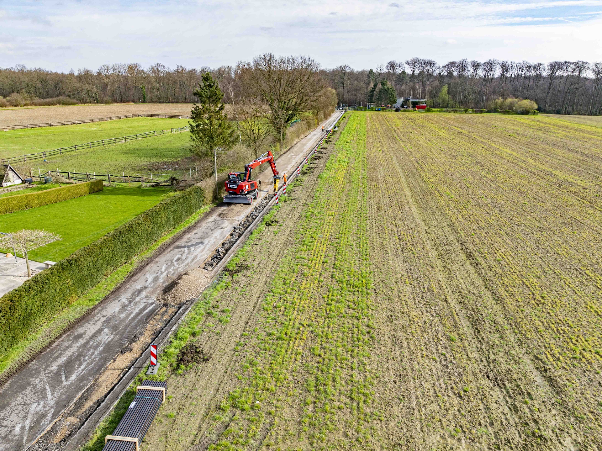 Verlegung einer rund acht Kilometer langen Druckrohrleitung zum Transport des Abwassers von der Kläranlage Selm-Cappenberg zur Kläranlage Selm-Bork: Auf der Zufahrtstraße zur Kläranlage Selm-Cappenberg wurde hierfür ein Graben für die Druckrohrleitung ausgehoben.