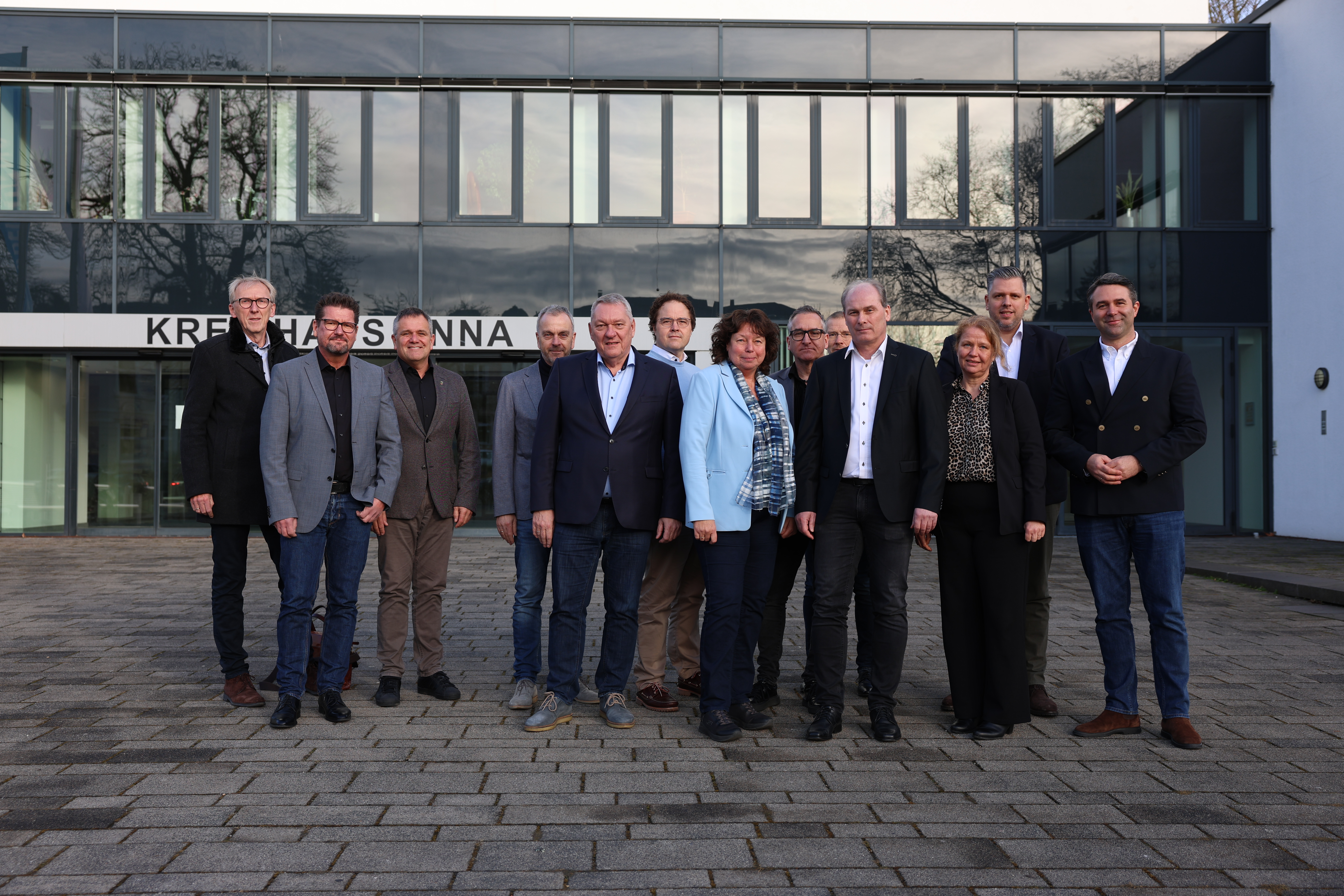 von links nach rechts: Günter Freck (Stadt Fröndenberg), Michael Strecker (Kreisstadt Unna), Andreas Heinrich (Gemeinde Holzwickede), Dirk Carbow (Gemeinde Bönen), Ferdinand Adam (Kreis Unna – Leiter Kämmerei), Marco Schulze-Beckinghausen (Stadt Werne), Sylvia Engemann (Stadt Selm), Dr. André Jethon (Stadt Lünen), Olaf Steuber (Kreis Unna), Christian Völkel (Stadt Kamen), Sandra Diebel (Stadt Bergkamen), Niklas Luhmann (Stadt Schwerte) sowie Philipp Reckermann (Kreis Unna – Kreisdirektor) nach der gemeinsamen Sitzung der Kämmerer und Kämmerinnen am Freitag, 16. Januar. Foto Lea Malzer – Kreis Unna