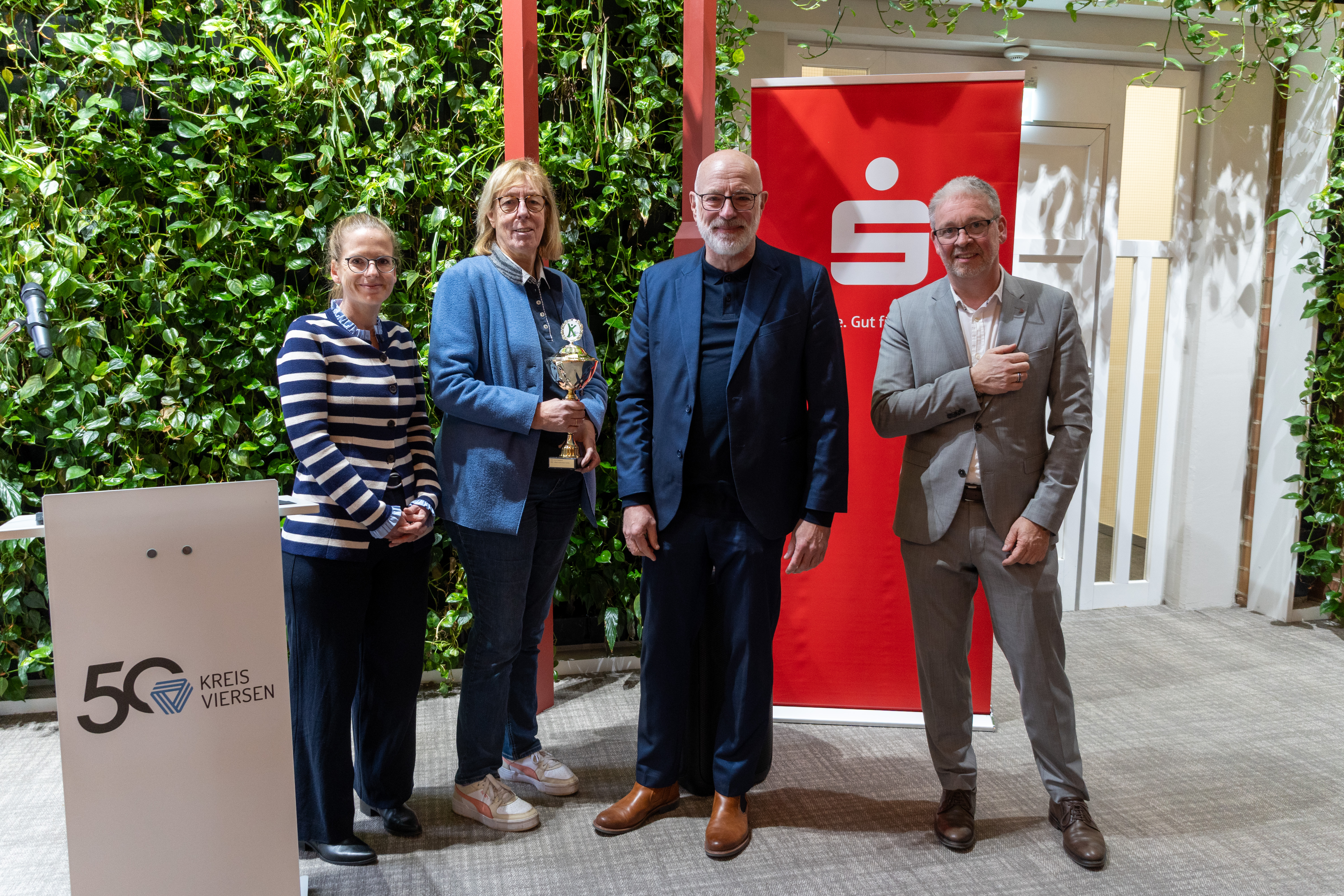 v.l.n.r.: Lisa Kreuels (Schulaufsichtsbeamtin Kreis Viersen), Angelika Feller (1. Vorsitzende KreisSportBund Viersen e.V.), Kreisdirektor Ingo Schabrich, Bernd Balsen (Vertreter der Sparkasse Krefeld) haben die Teilnehmenden der Lauf- und Sportabzeichen Wettbewerbe geehrt.