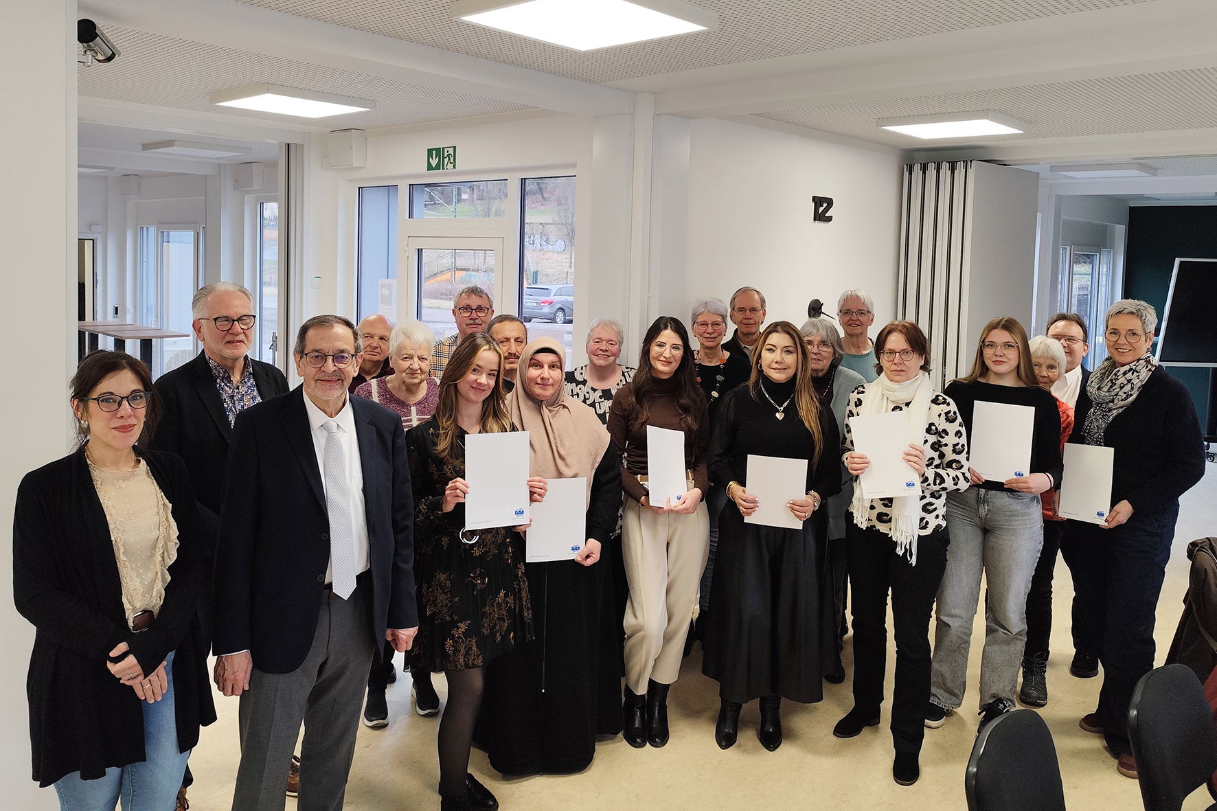 Ehrenamtlichen Seniorenbegleiterinnen und Seniorenbegleitern erhalten vom stellvertretenden Bürgermeister der Stadt Iserlohn, Michael Scheffler, ihr Ausbildungszertifikat.