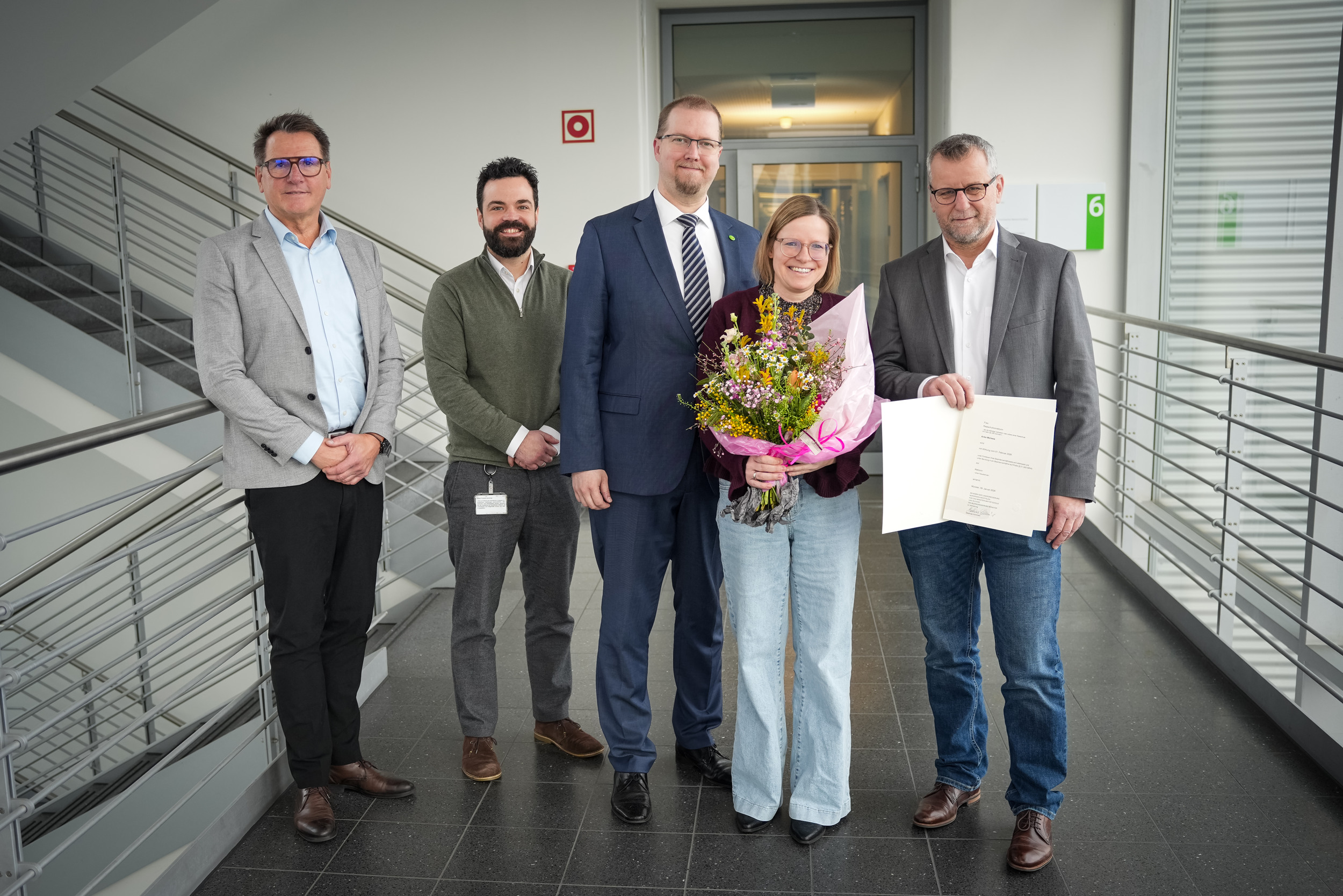 Der neuen Schulleiterin Anke Meilwes gratulieren (von links): Fachbereichsleiter Dirk Lueg, Geschäftsbereichsleiter Jonas Bühs, Schuldezernent Björn Volmering sowie Schulamtsdirektor Michael Ballmann (rechts).