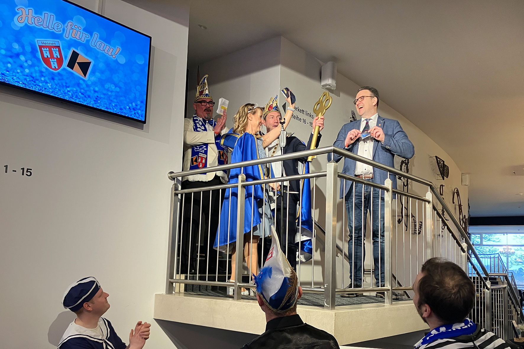 Gemeinsam mit dem Prinzenpaar Heike II. und Ralf II. entlockt Benedikt Lowinski, Sitzungspräsident der Hennener Kolpingfamilie, Bürgermeister Michael Joithe den Amtsschlüssel und die Prinzessin schnitt ihm die Krawatte ab.