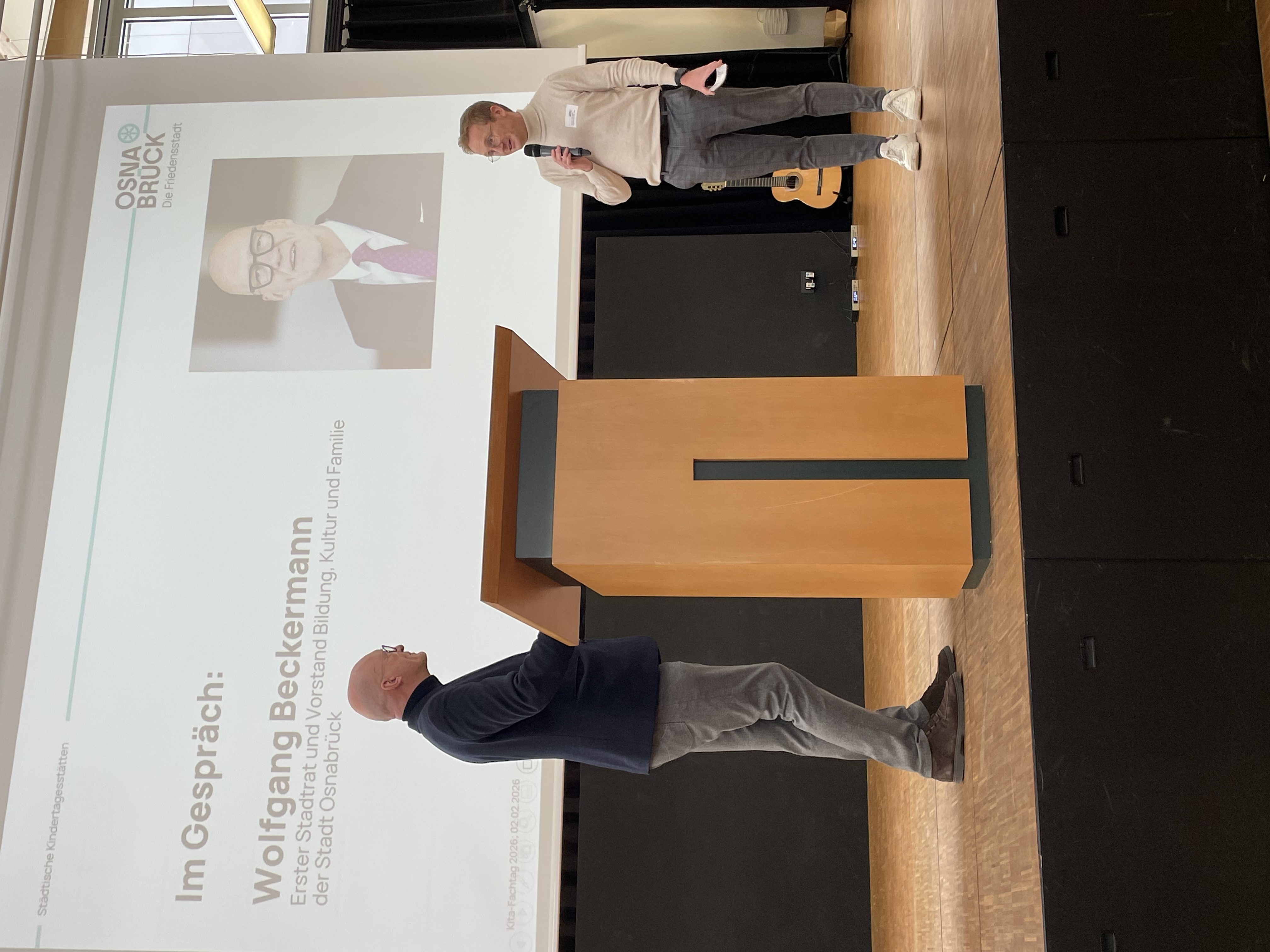 Erster Stadtrat Wolfgang Beckermann auf dem Podium im Gespräch mit Michael Lührmann (Moderator der Veranstaltung und Fachberater der städtischen Kitas)