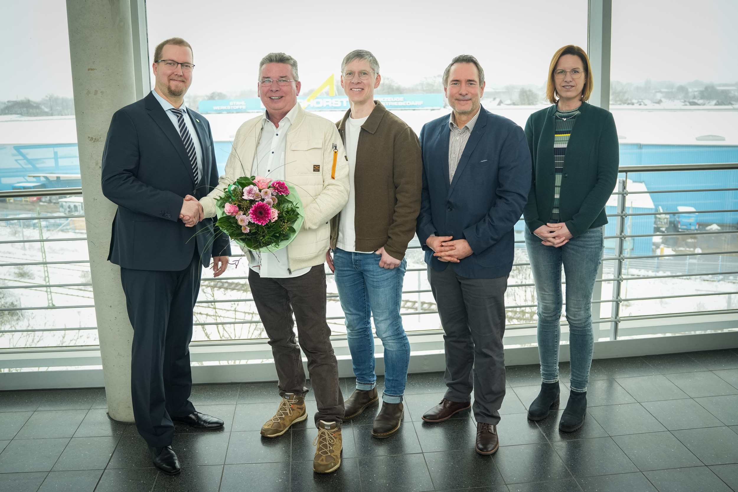 Ehrenamtskoordinator Rainer Howestädt (2. von links) verlässt die Stadt Bocholt. Von ihm verabschieden sich Bocholts Erster Stadtrat Björn Volmering (links) sowie (von rechts) Sabine Kürten (stv. Fachbereichsleiterin Soziales), Max Benda (Fachbereichsleiter Soziales) und Christian Tewiele (Geschäftsbereichsleiter Ehrenamt, Senioren, Betreuung und Rente).