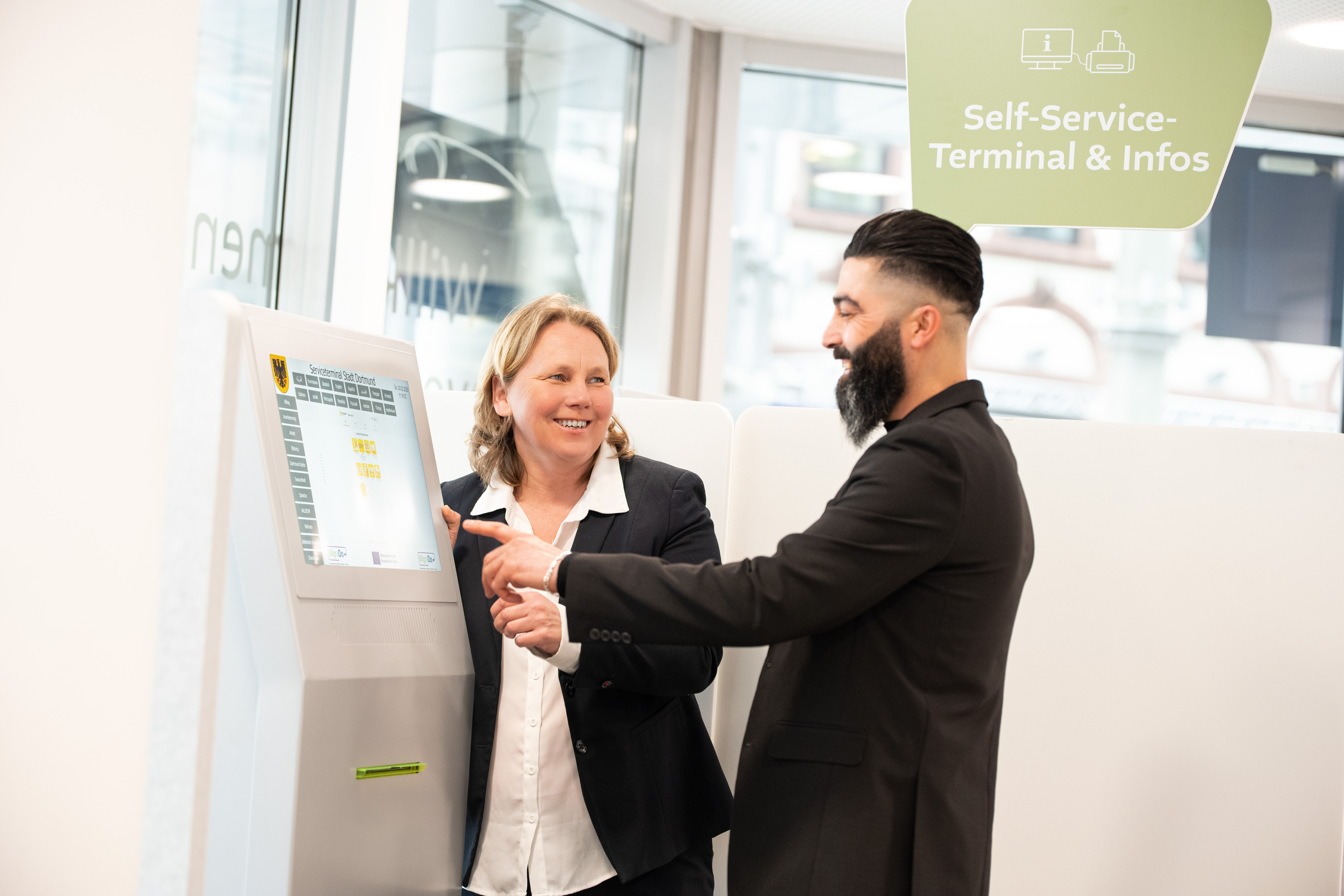 Silke Straubel, Leiterin des MigraDo, erläutert einem Kunden die Bedienung des Service Terminals.