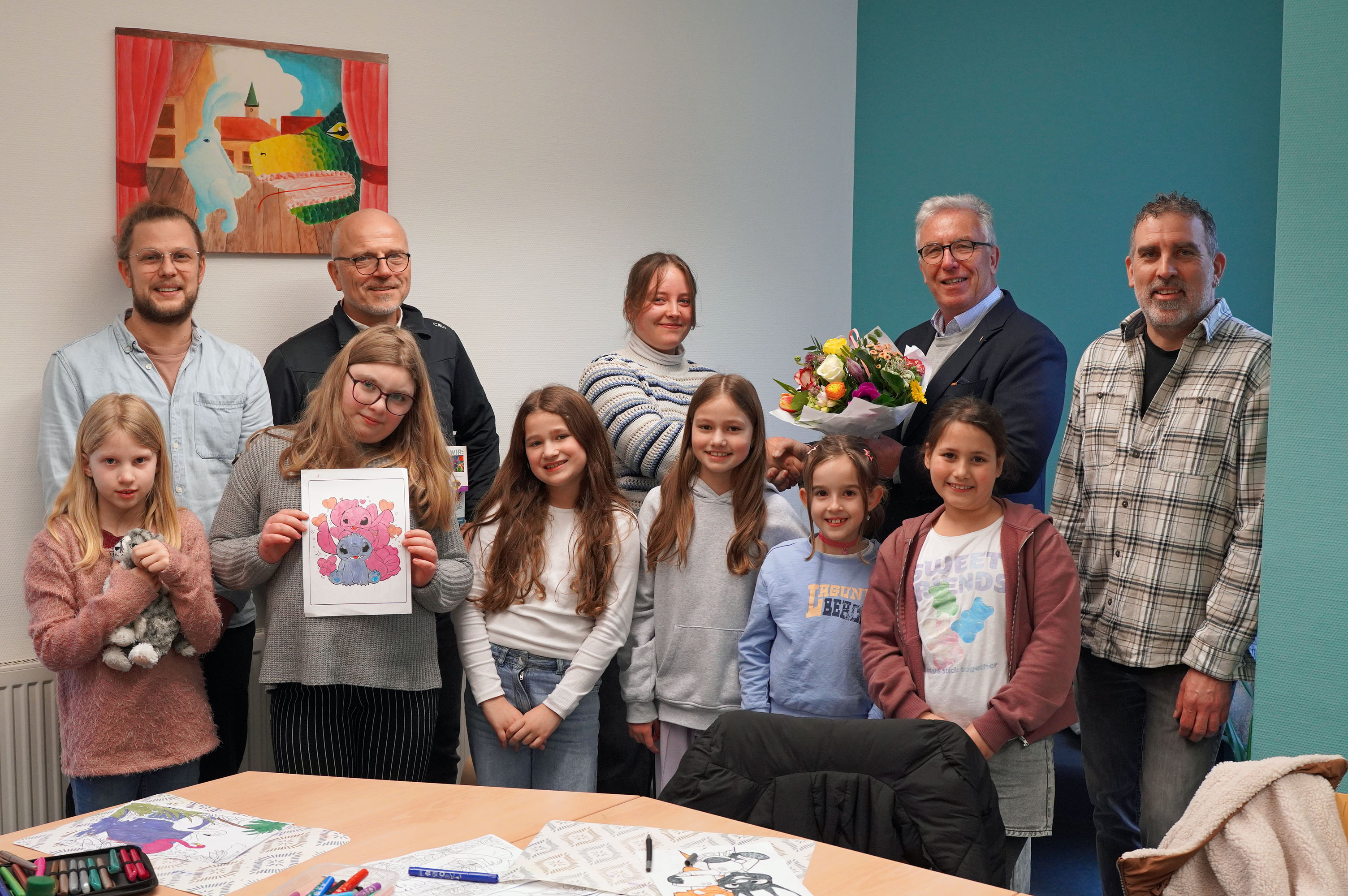 Dr. Helmut Kern (2.v.r.), Präsident des Lions Clubs Unna Via Regis, und Veit Pothmann (2.v.l.) überreichten der neuen „Kikouba“-Gruppenleiterin Jana Oeste zur Begrüßung einen Strauß Blumen. Das Foto zeigt sie mit Kindern aus der „Kikouba“-Gruppe in der Gartenvorstadt sowie Stadtteilkoordinator Matthias Meisohle (l.) und Miguel Grosch vom Kinder- und Jugendbüro der Kreisstadt Unna.