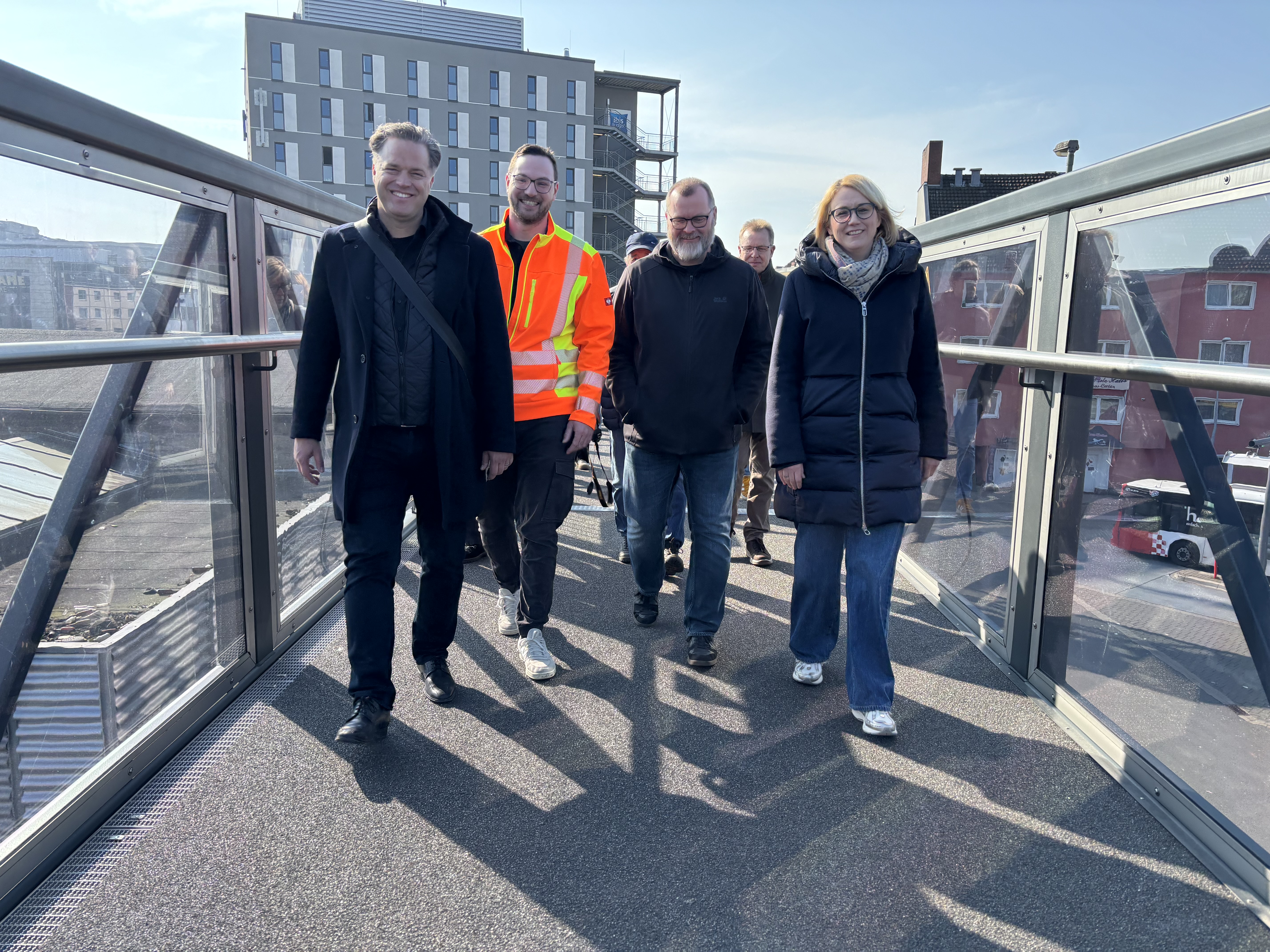 Einweihung bei schönstem Sonnenschein: (von links) Stadtbaurat Thimo Weitemeier, Bauleiter Nils Vorreyer, Mike Bohne, Leiter des Fachbereichs Geodaten und Verkehrsanlagen, und Oberbürgermeisterin Katharina Pötter waren die ersten, die die Brücke nach der Wiedereröffnung überquert haben.