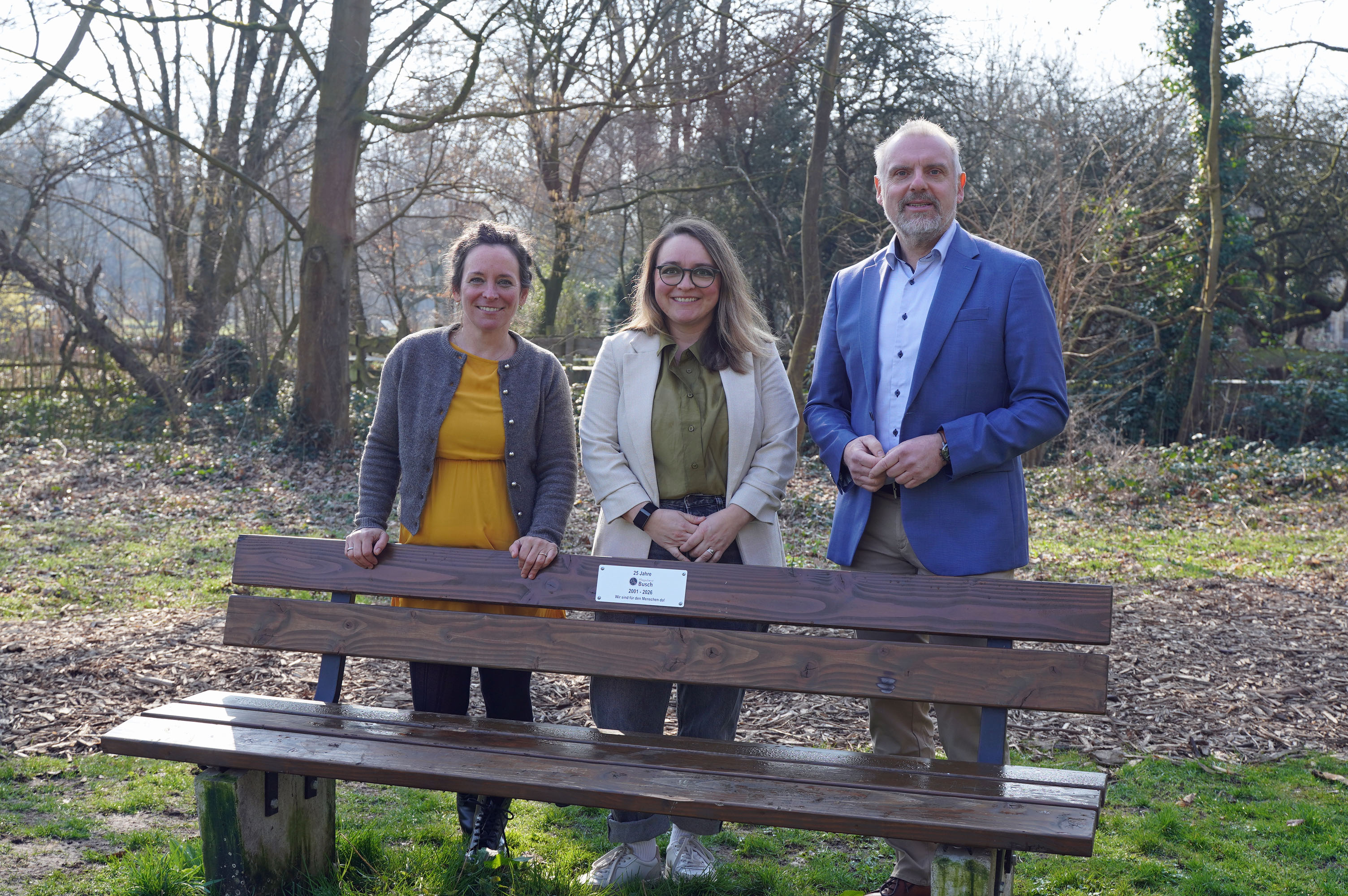Bürgermeister Dirk Wigant und die Geschäftsführerinnen des Pflegedienstes Busch, Mira Steinhoff-Busch (l.) und Constanze Wesnigk, stehen an der neuen Sitzbank, die zum Verweilen am Bürgerwald im Kurpark einlädt.