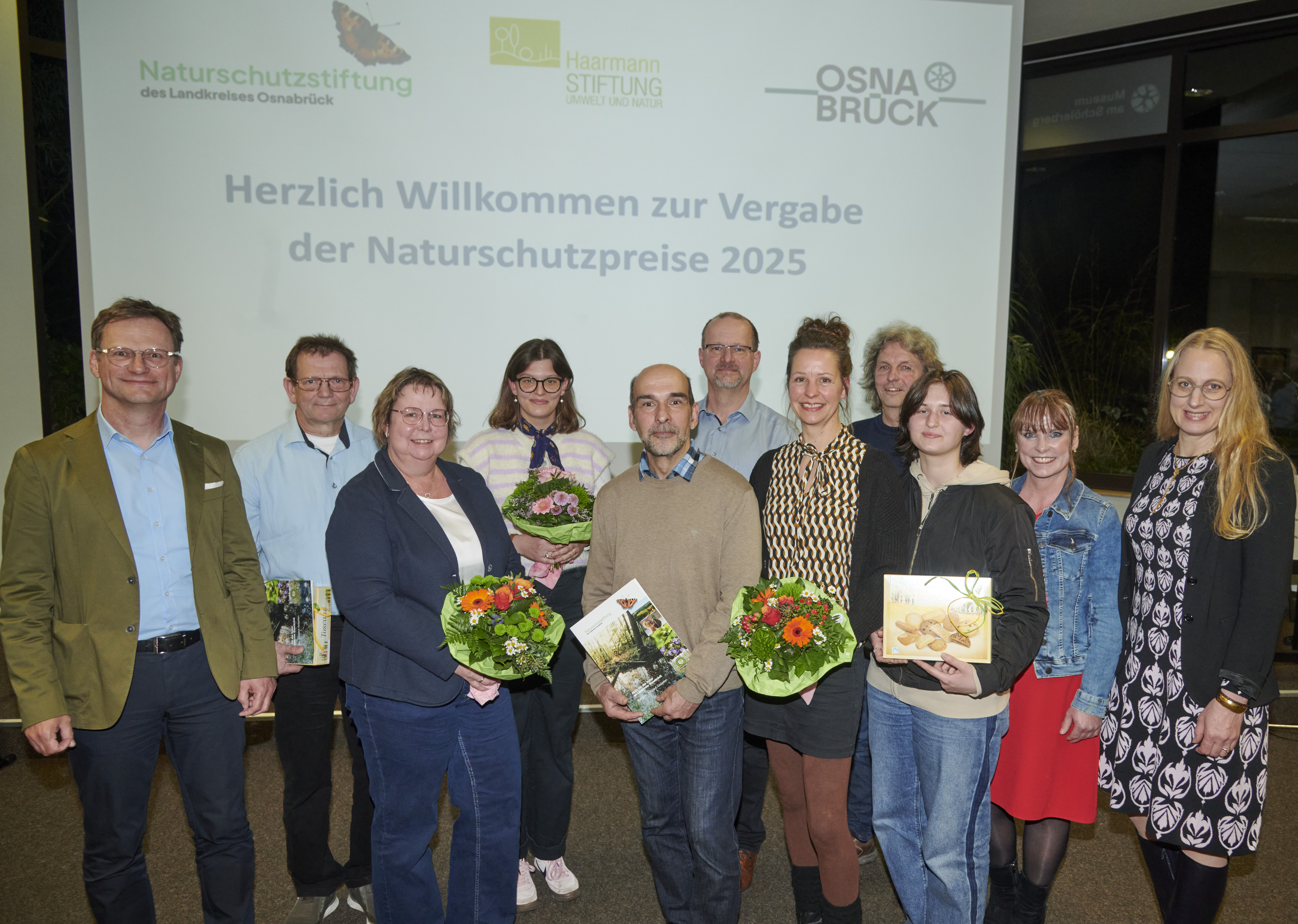 Die Preisträger des Naturschutzpreises 2025 aus dem Landkreis Osnabrück mit Landrätin Anna Kebschull (rechts), Kreisrat Thomas Könnecker (Geschäftsführer der Naturschutzstiftung, links) und der Kuratoriumsvorsitzenden Gabriele Mörixmann (2. von rechts).