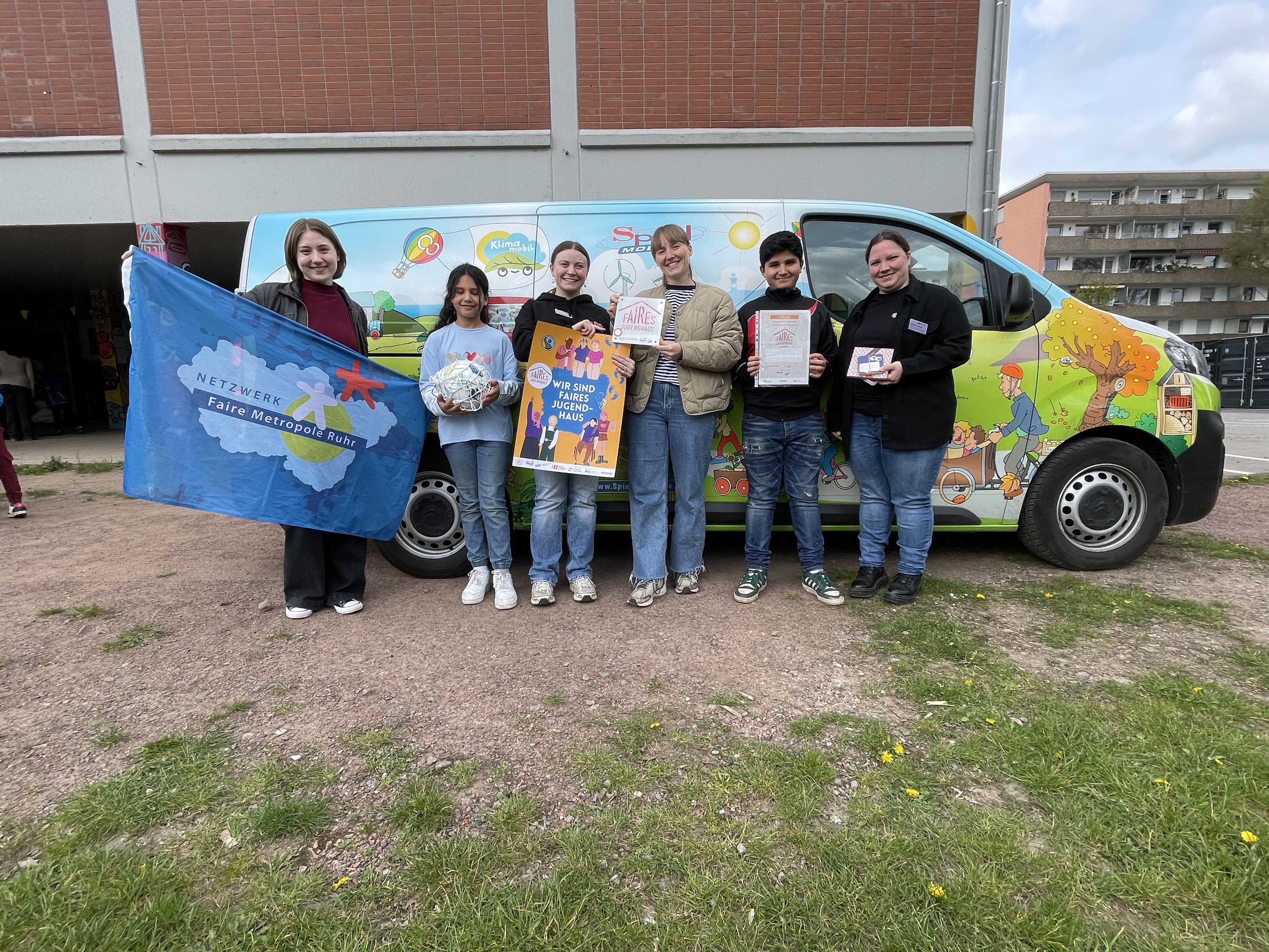 Freuen sich über die Auszeichnung: Paulina Knust (Faire Metropole Ruhr e.V.), Amona Alshamat (Besucherin), Irina Kremer (Einrichtungsleitung des KJT Bövi), Tamara Kaschek (Faire Metropole Ruhr e.V.),Mohamed Alshamat (Besucher), Stefanie Hellweg (Fachreferentin d. Kinder-und Jugendförderung)