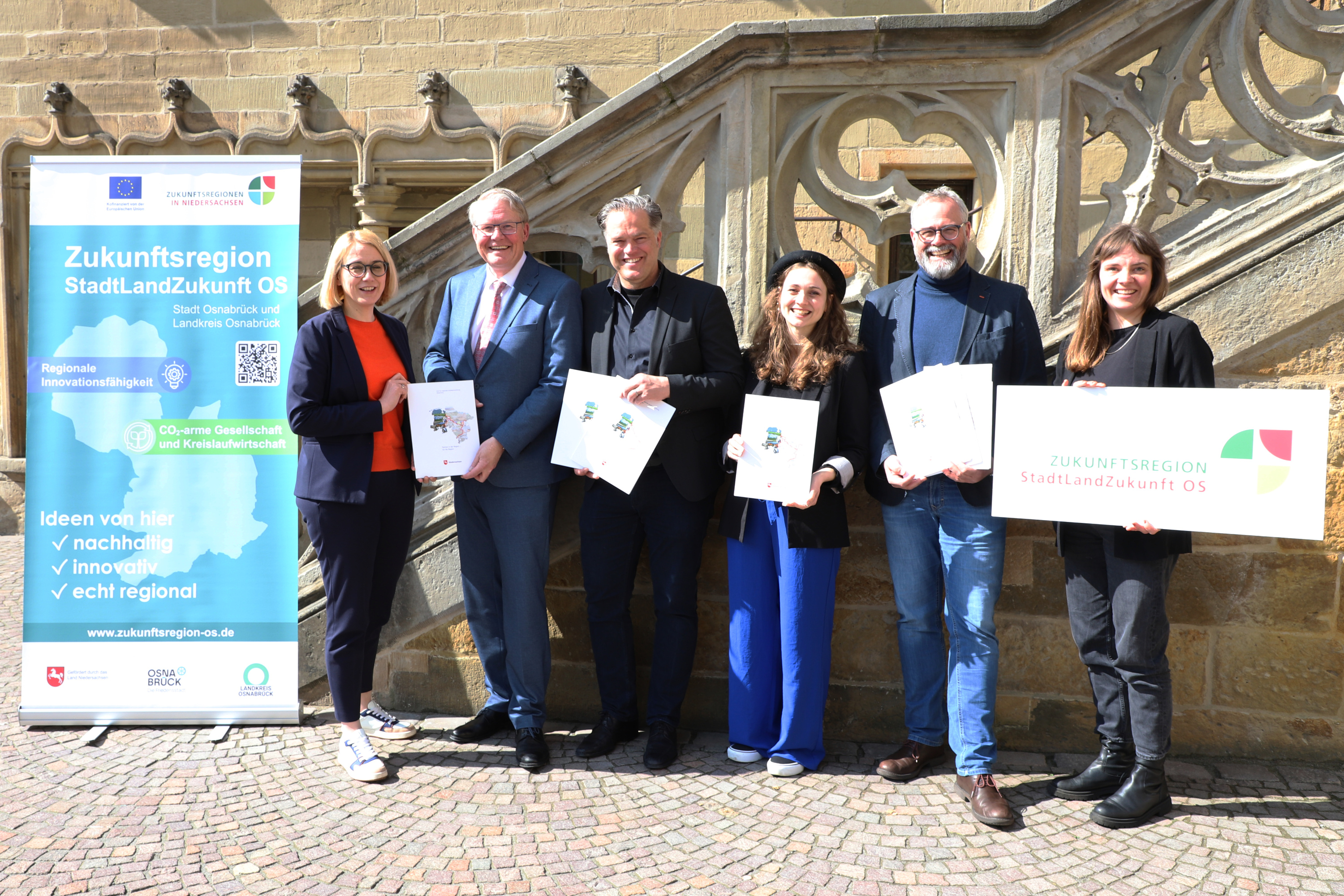 Zur feierlichen Übergabe der Förderbescheide trafen sich (von links) Oberbürgermeisterin Katharina Pötter, Nikolaus Jansen (Amt für regionale Landesentwicklung Weser-Ems), Stadtbaurat Thimo Weitemeier, Marie-Theres Lohmann (Wirtschaftsförderung Osnabrück), Dr. Claas Beckord (Referat für nachhaltige Stadtentwicklung) und Lisa Voßiek (Zukunftsregion StadtLandZukunft OS).