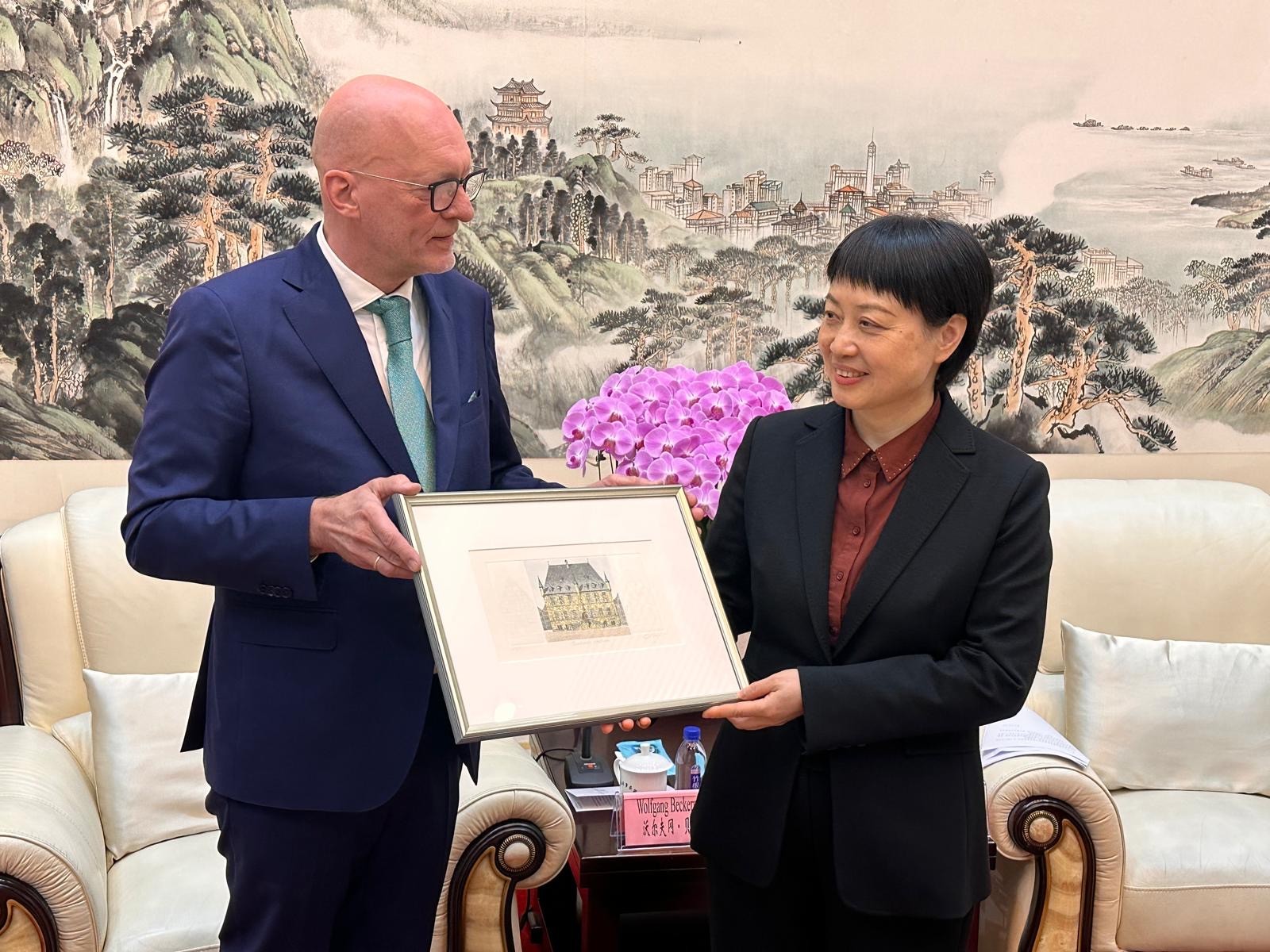 Erster Stadtrat Wolfgang Beckermann überreicht ein Bild des Osnabrücker Rathauses an Hefeis stellvertretende Bürgermeisterin Wang Haixia.