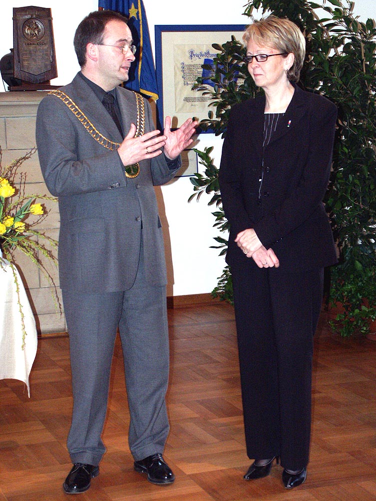 Hannelore Kraft, Ministerin für Wissenschaft und Forschung des Landes Nordrhein-Westfalen, weilte am 13.3.2003 im Rahmen der Veranstaltung "50 Jahre Hochschultage" auf Einladung der VHS Bocholt-Rhede-Isselburg in Bocholt. Hier sehen wir sie im Gespräch mit Bürgermeister Klaus Ehling, der Frau Kraft im Saal des Historischen Rathauses empfing.