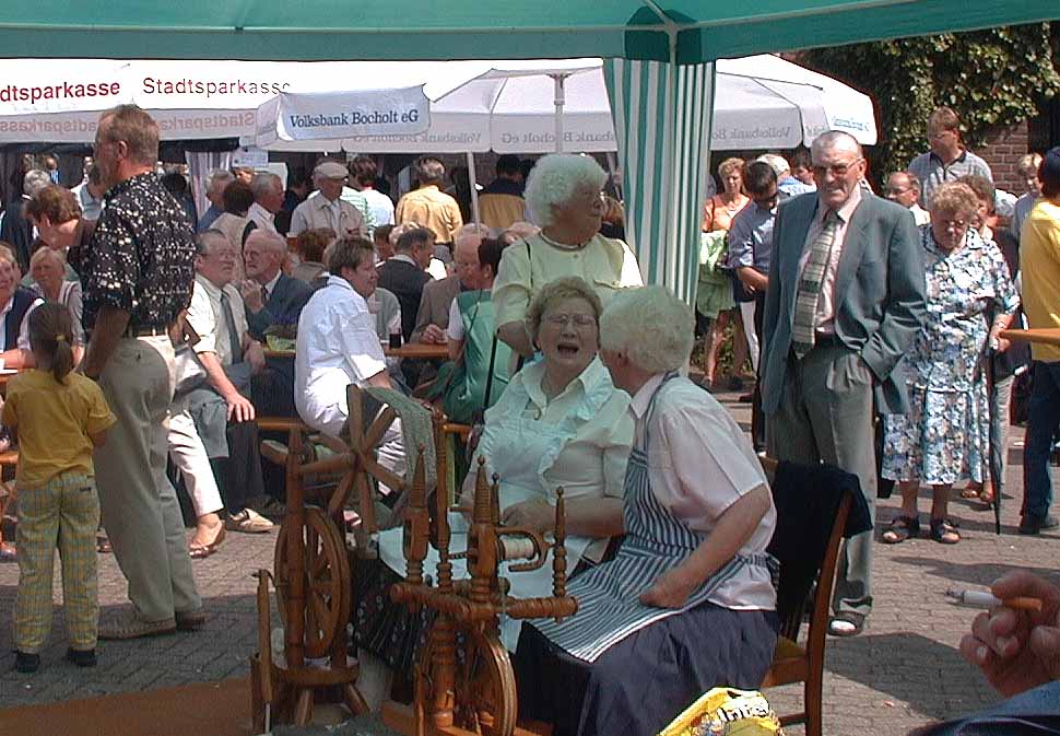 Eugenie Kathemann und Maria Bühs waren mit ihrer Wollverspinnung eine der Attraktionen auf dem Barloer Kreativ- und Töpfermarkt in Barlo am 26. und 27. Juni 1999