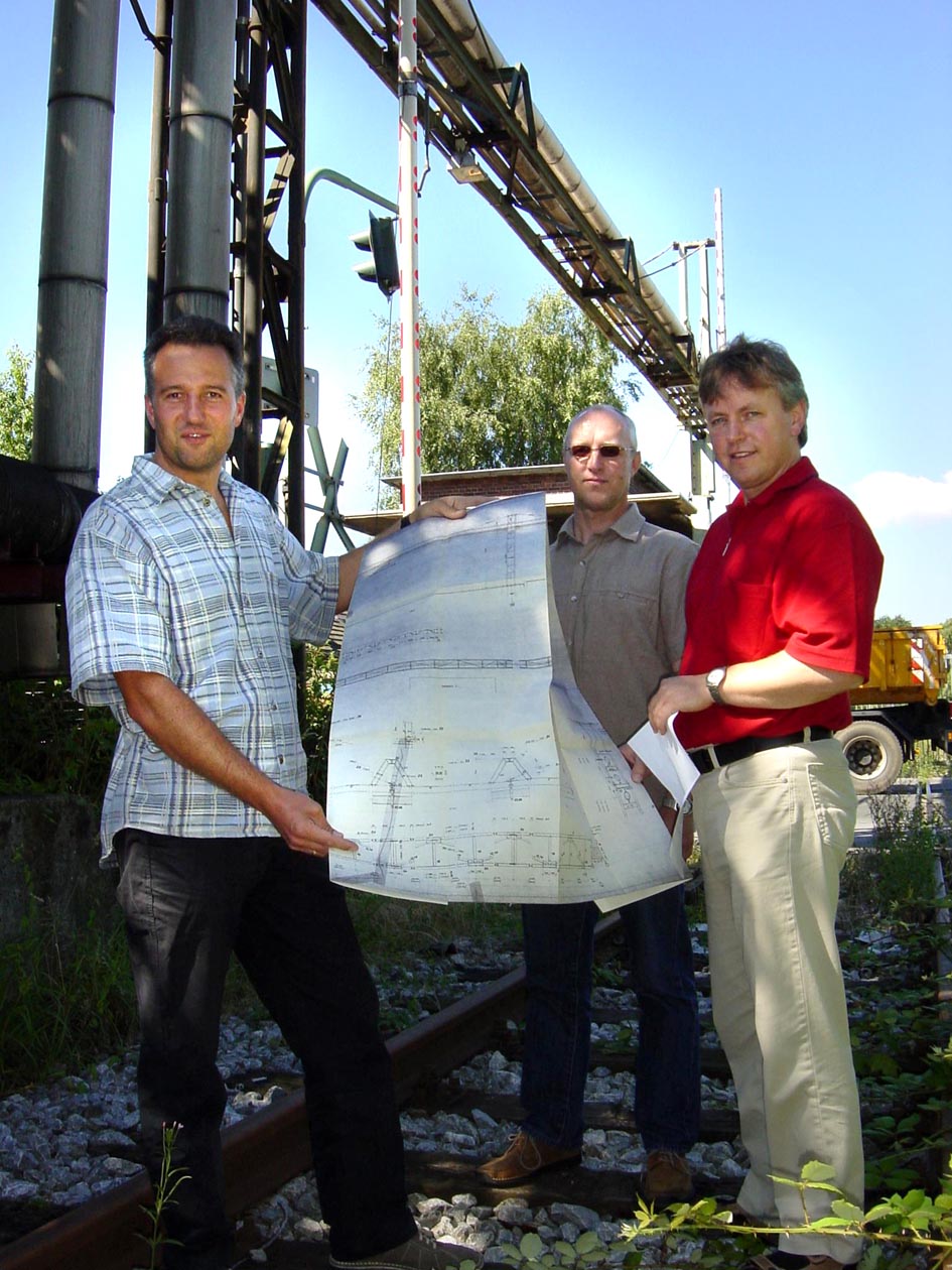 Die Fernwärme-Abteilung der Hertener Stadtwerke (v.l. die Mitarbeiter Christian Sommerfeld, Bernd Kruse und Hauptabteilungsleiter Detlef Großjohann) demontiert ab kommenden Montag die in die Jahre gekommene Rohrbrücke auf der Feldstraße.