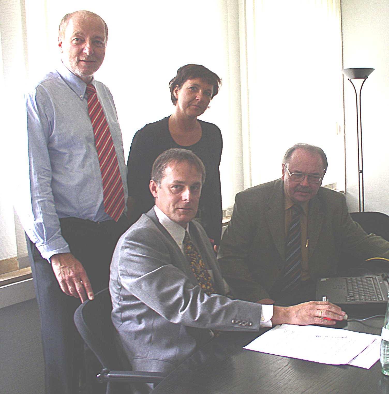 v.l. Bürgermeister Klaus Bechtel, Architekt Gerd Junker, Internetbeauftragte Barbara Hinse und Heinz Schöler von der Bauordnung stellen den neuen Online-Service der Hertener Stadtverwaltung vor.