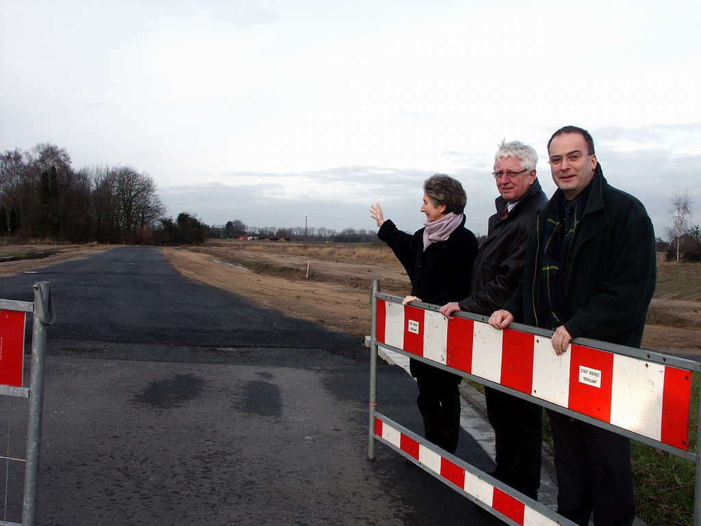 Machen den Weg frei fürs Gewerbegebiet Holtwick, Helga Grunewald, Vorsitzende des Ausschusses für Verkehrs- und Wirtschaftsförderung, Klaus Kaiser, Leiter des Fachbereichs Stadtentwicklung und Wirtschaftsförderung und Bürgermeister Klaus Ehling (v.l.)