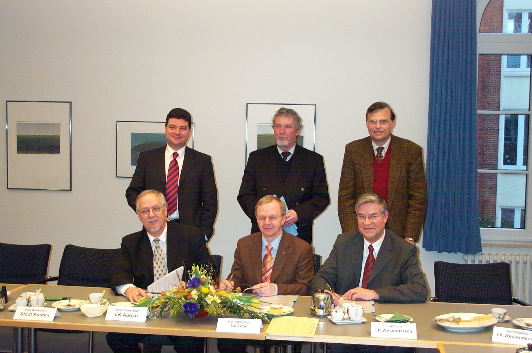 von links (sitzend): Landrat Walter Theuerkauf (Aurich), Landrat Bernhard Bramlage (Leer), Landrat Manfred Bergner (Wesermarsch), dahinter: Landrat Jörg Bensberg (Ammerland), Oberbürgermeister Alwin Brinkmann (Emden) und Oberkreisdirektor Jürgen Mumdey (Wesermarsch).