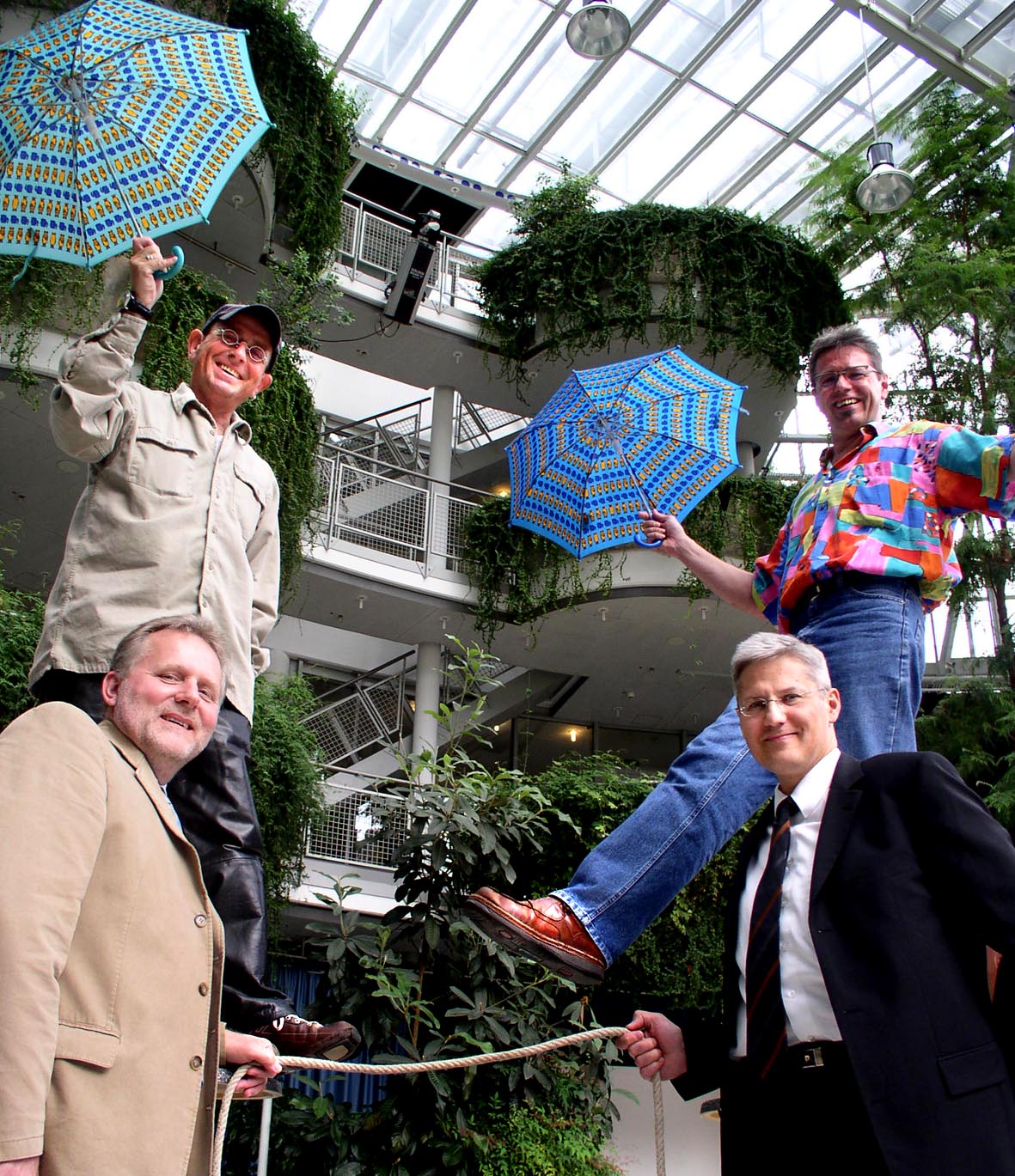 "Hochseilartistik light": Vorfreude auf den Kultursommer herrscht bei den Hochseilakrobaten Oswald Petermann (oben li.) und Bernd Uppena (oben re.) sowie bei den Sponsoren Gisbert Büttner (Hertener Stadtwerke, li.) und Wilhelm Uhlenbruch (Volksbank, re.).
